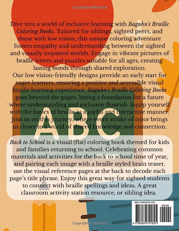 Inclusive Learning: Tailored for siblings of blind children, sighted classmates, and those with low vision who may need braille in the future, Baguhn's Braille Coloring Books create a parallel learning experience for sighted children, fostering curiosity and appreciation. This coloring book is flat, does not contain any embossed braille or tactile components. Back to School Is a coloring book themed for kids and families returning to school. Celebrating common materials and activities for the back to school time of year, and pairing each image with a braille styled brain teaser, use the visual reference pages at the back to decode each page’s title phrase. Enjoy this great way for sighted students to connect with braille spellings and ideas. A great classroom activity station resource, or sibling idea. Coloring pages are single sided to minimize bleed through for low vision students using bold markers. Visual only, contains no tactile elements.