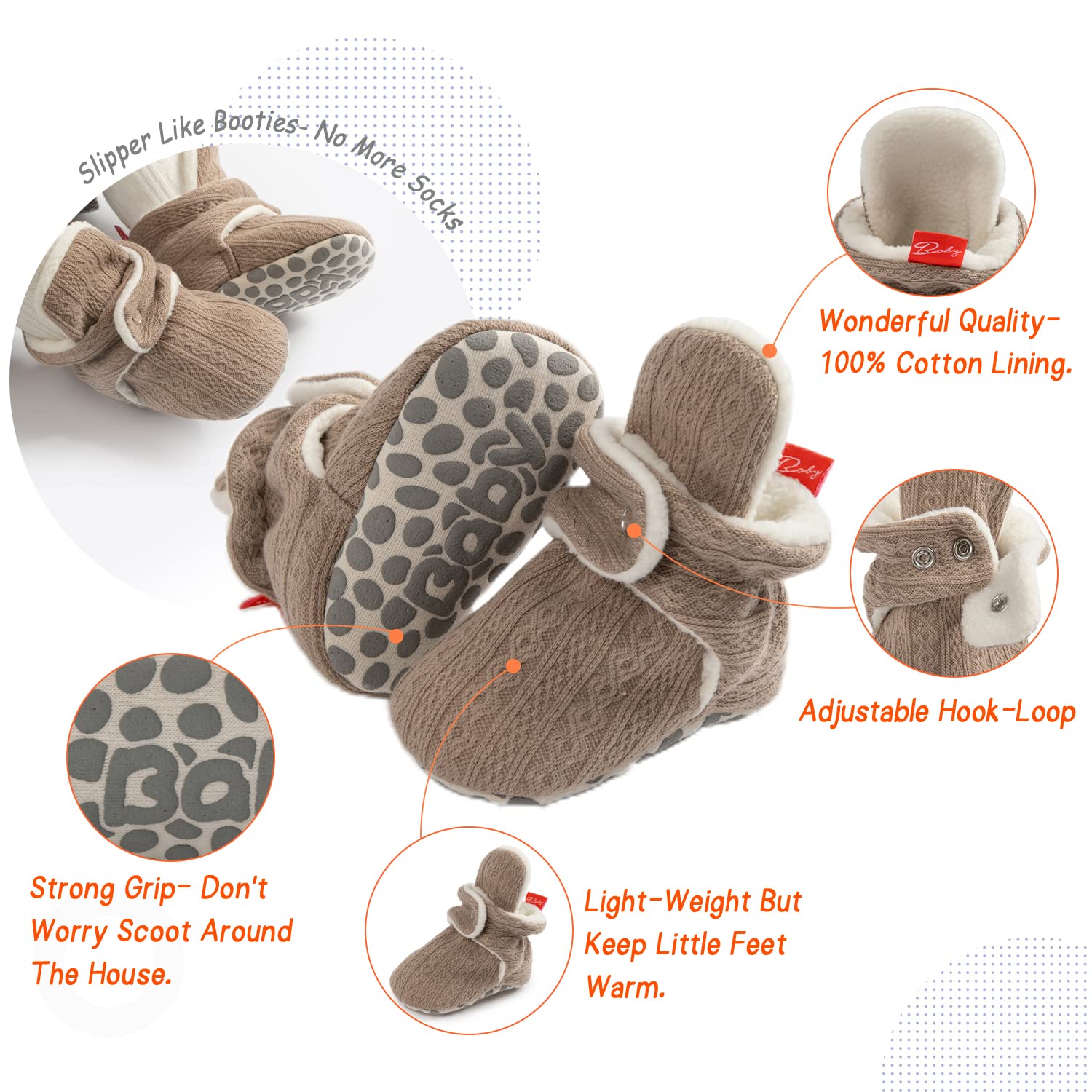 Got A Little Kicker: Anti-slip bottoms makes learning to walk safer and easier. These stay on crib booties are wrapped, cozy & comfortable on baby's skin; When you're tying to layer up, hook & loop closed is really adorable; Elastic ankle support makes putting them on and taking them off, still keep feet covered, warm all day and night