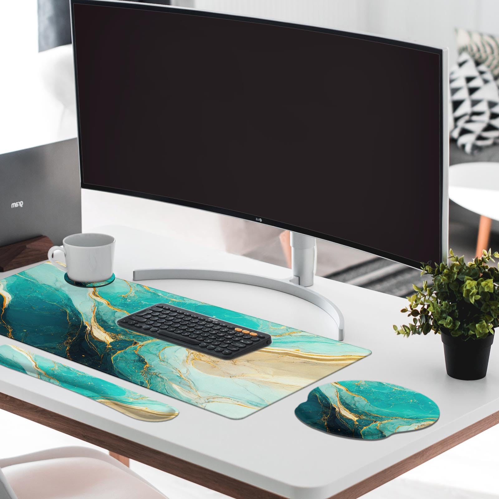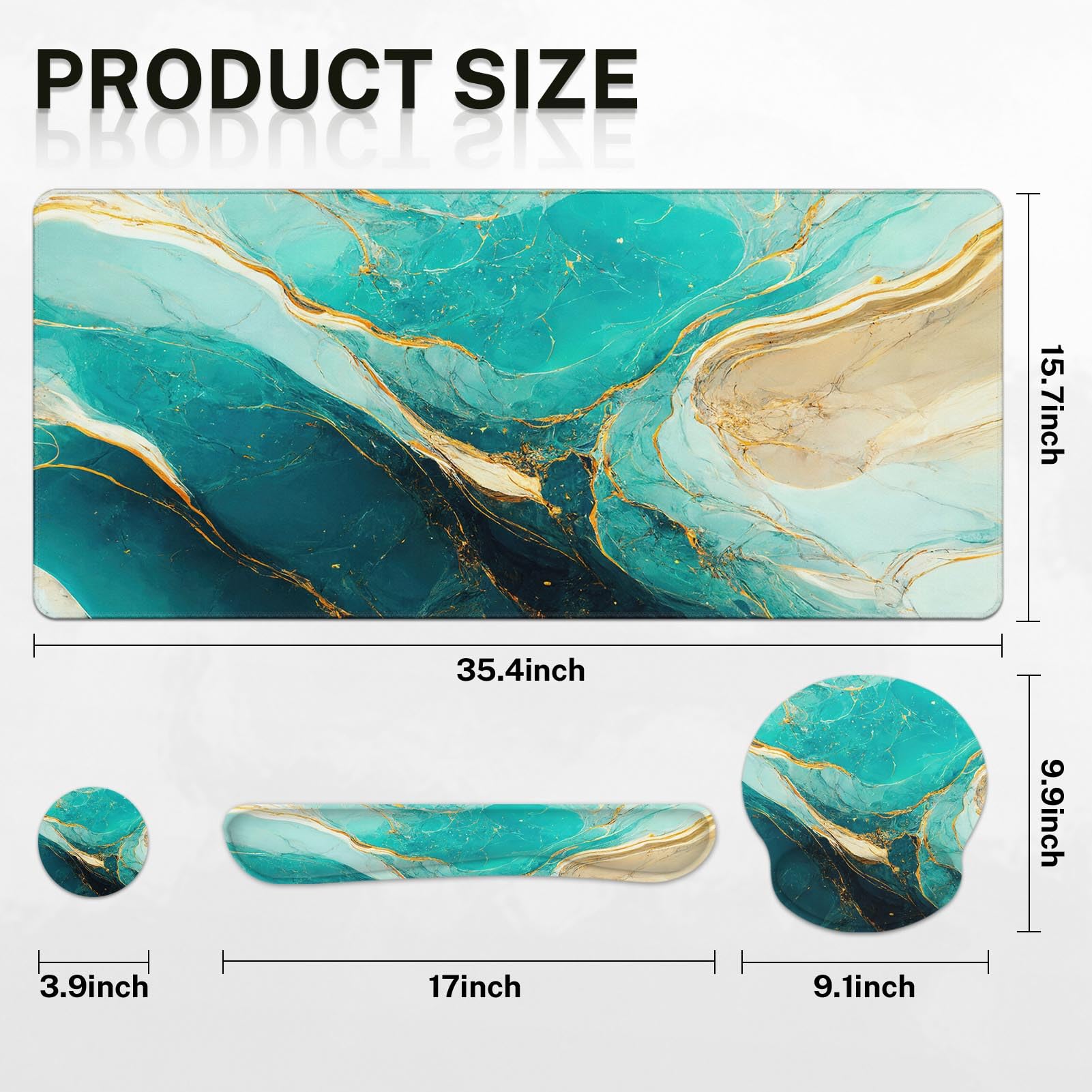 Comprehensive 4-in-1 Mouse Pad Set:This all-inclusive mouse pad set offers a large desk pad (35.4x15.7inch),a keyboard wrist rest (16.9x3.3inch),a mouse wrist rest (9.8x9.1inch),and a cup coaster (3.9x3.9inch).All these accessories come together at an incredible value,saving you the hassle and expense of separate purchases.This spacious desk pad can accommodate your mouse,gaming keyboard,and other desk essentials,while maintaining aclean.