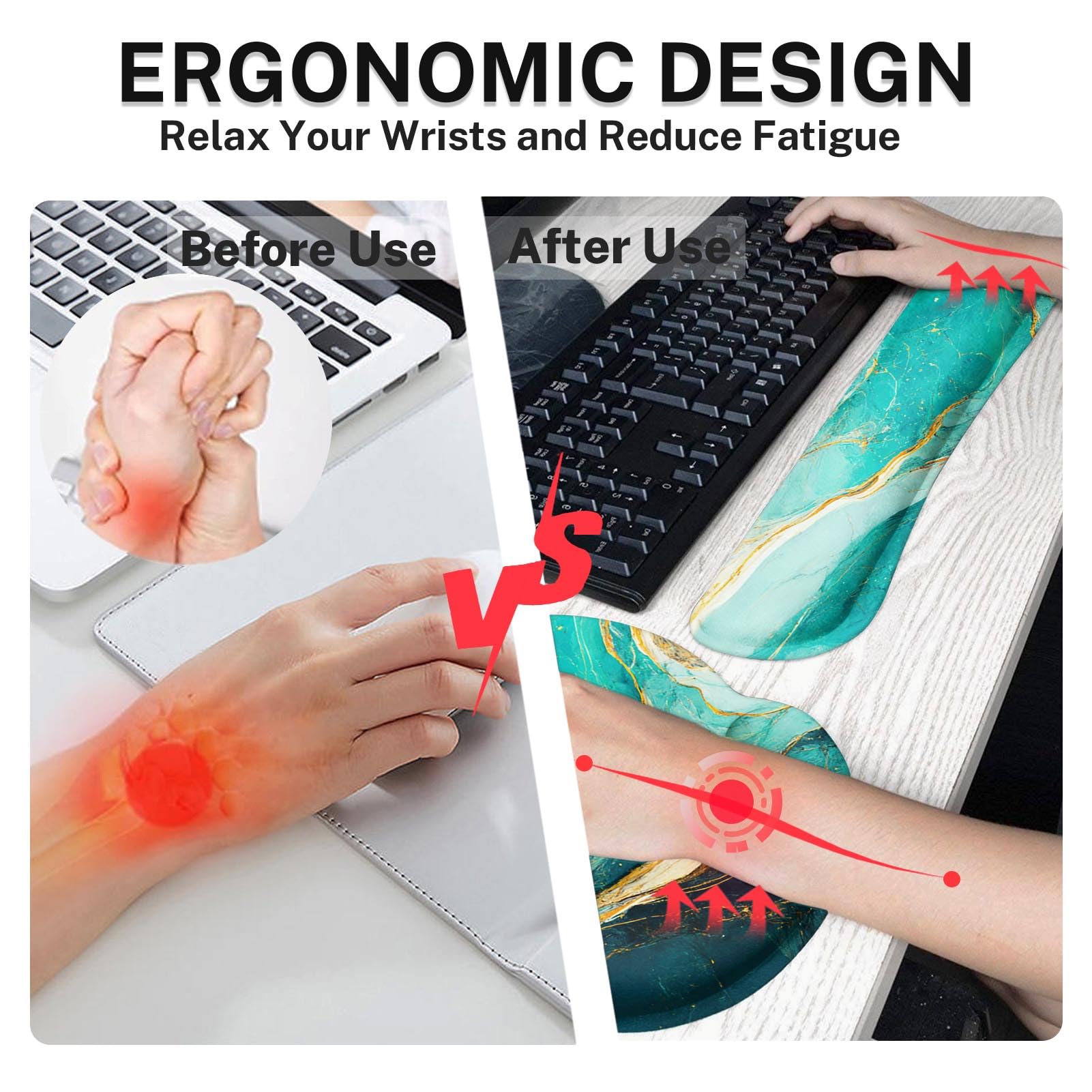 Ergonomically Designed for Comfort:The mouse pad and wrist support set are designed with memory foam and covered with a soft,smooth material,ensuring lightweight comfort and durability for your daily work life.They are ergonomically contoured to prevent soreness in your arms,wrists, and hands during long working or gaming sessions,thus significantly reducing stress and fatigue.