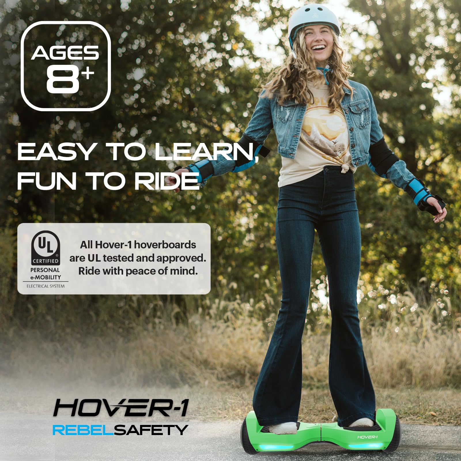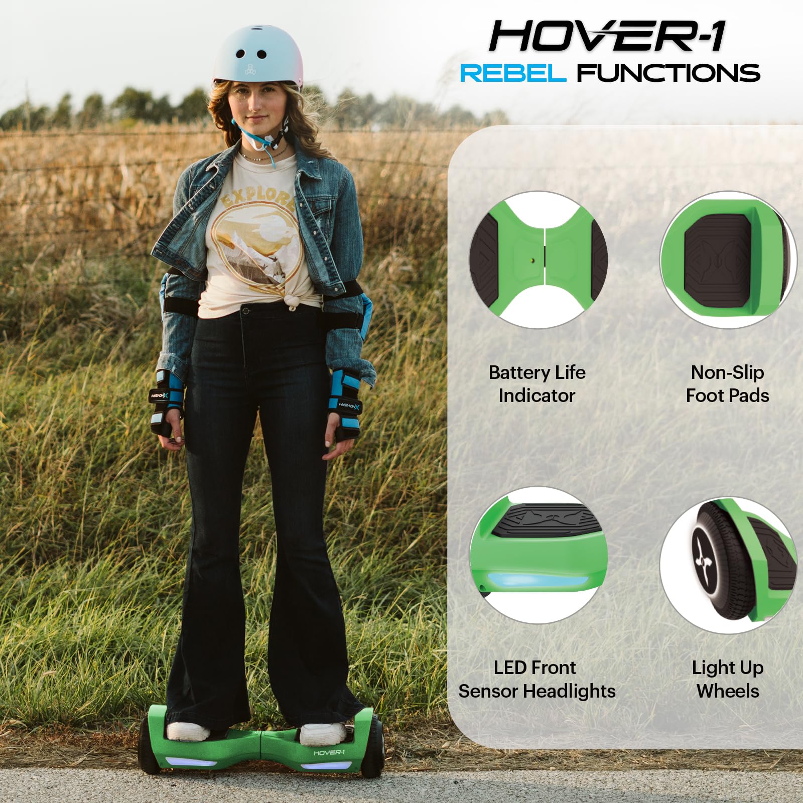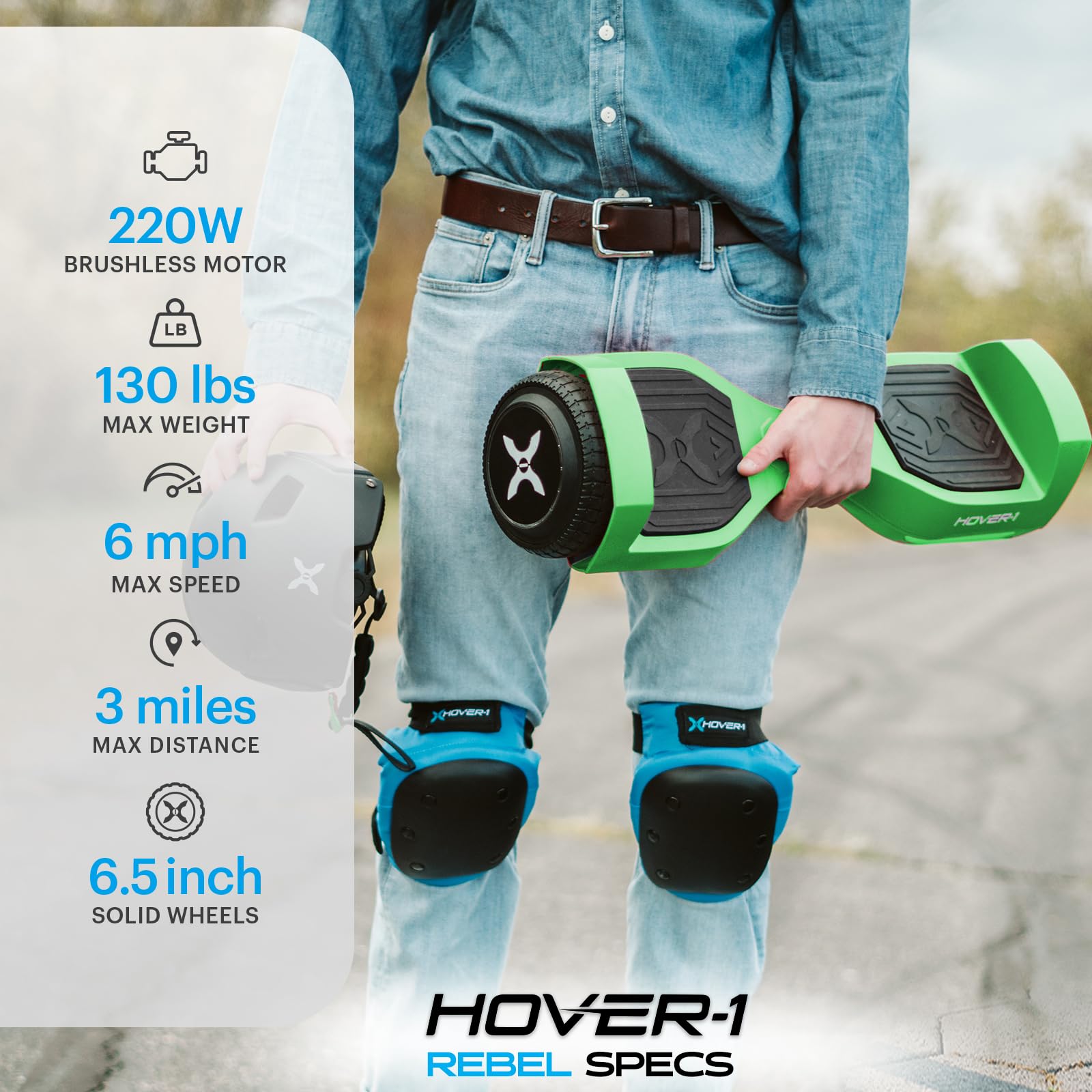 Rebel against the ordinary with the Hover-1 Rebel self balancing scooter! Rebel is the perfect entry-level self balancing board for young riders to gain confidence with simple riding controls. Non-slip foot pads keep you in place while the dynamic inertia stabilization system keeps you balanced and upright. LED headlights and wheel lights illuminate the path ahead and add some fun to the riding experience. The Hover-1 Rebel supports riders up to 130 pounds and is powered by two 110W motors that propel it to a top speed of 6 mph. The rechargeable lithium-ion battery keeps Rebel going for up to 3 miles of riding on a single charge! Start your smart balance wheel adventure off right with the Hover-1 Rebel.