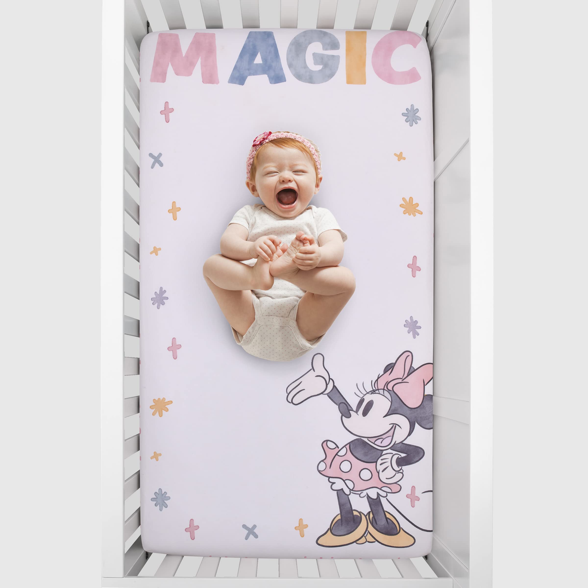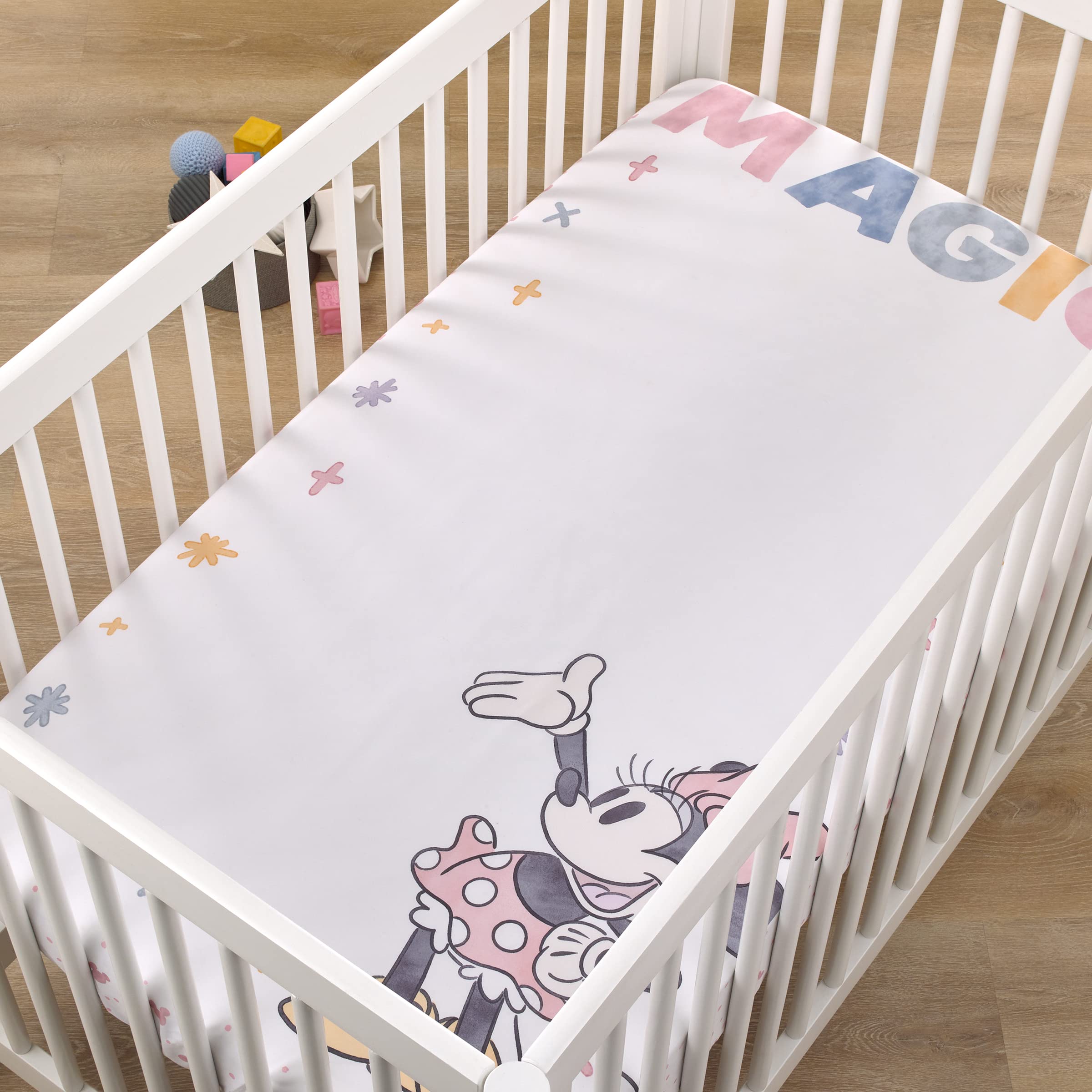 The Minnie Mouse Lovely Little Lady Photo Op Fitted Crib Sheet is designed to create the perfect photo opportunity by capturing baby's milestones and special moments! Features Minnie Mouse with icons and dots and encouraging words, You are Made of Magic! This adorable sheet comes in shades of pink, white, gray and gold with pink and white dots and icons along the borders edge. Measures 28" x 52" x 8" and fits a standard size crib/toddler mattress. Includes full elastic for a safe and snug fit. Made of cozy soft fabrics and is machine washable for easy care. Coordinates with a complete line of Disney Minnie Mouse Lovely Little Lady Bedding and Accessories!