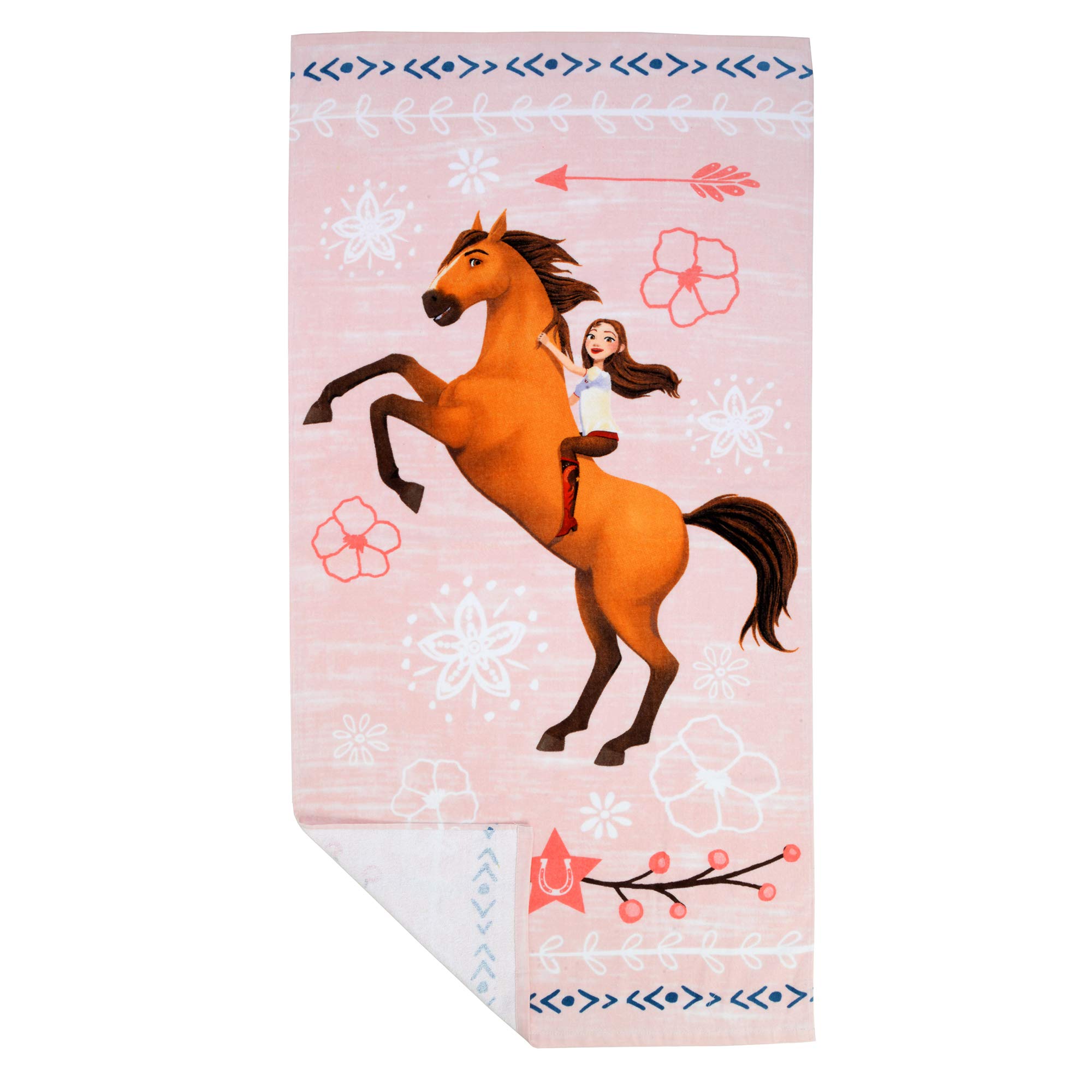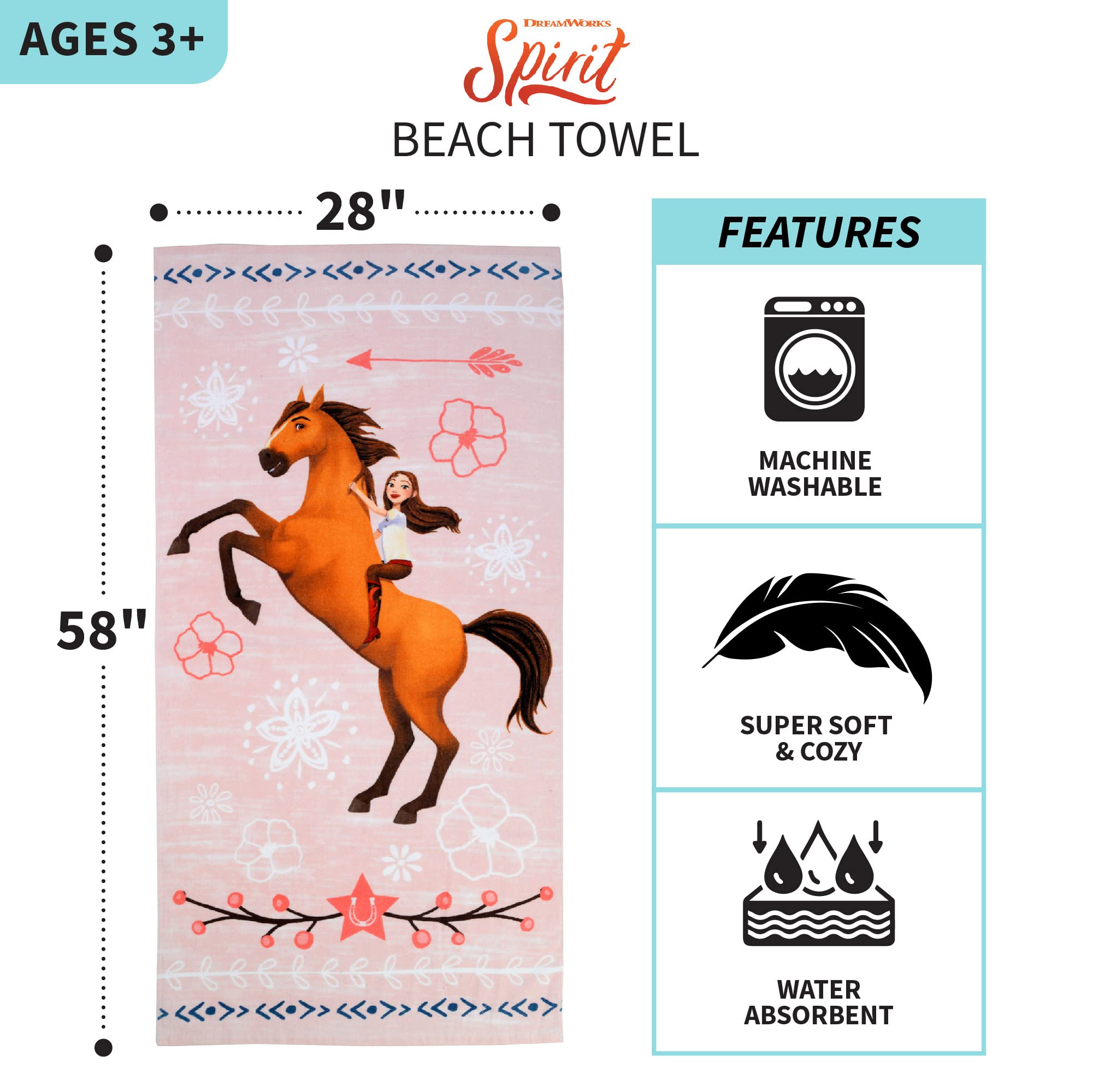 SPIRIT RIDING FREE DESIGN: Wild horses couldn't drag your kids away from this cool and colorful beach towel. This animated pink towel features bold imagery of Lucky and Spirit from the popular DreamWorks series Spirit: Riding Free.