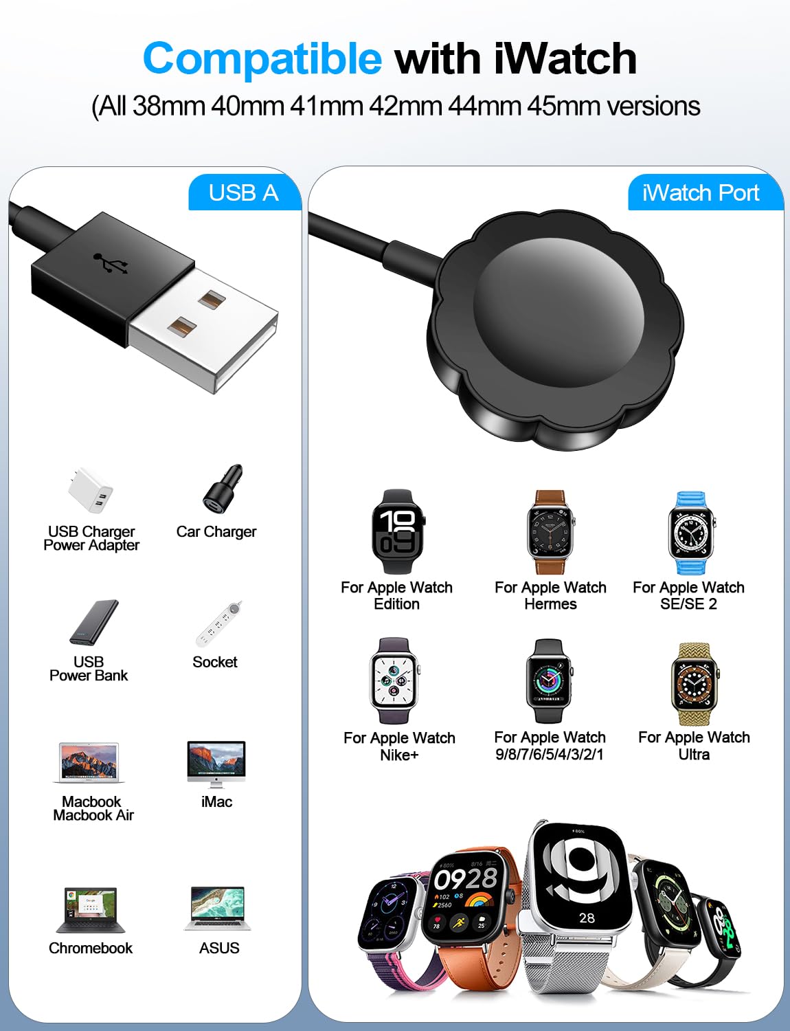 【Wide Compatible】- Our wireless batteries charger is compatible with iWatch series Ultra2/Ultra/10/9/8/7/6/SE2/SE/5/4/3/2 (including the 38 mm/40 mm/41 mm/42 mm/44 mm/45 mm Version)