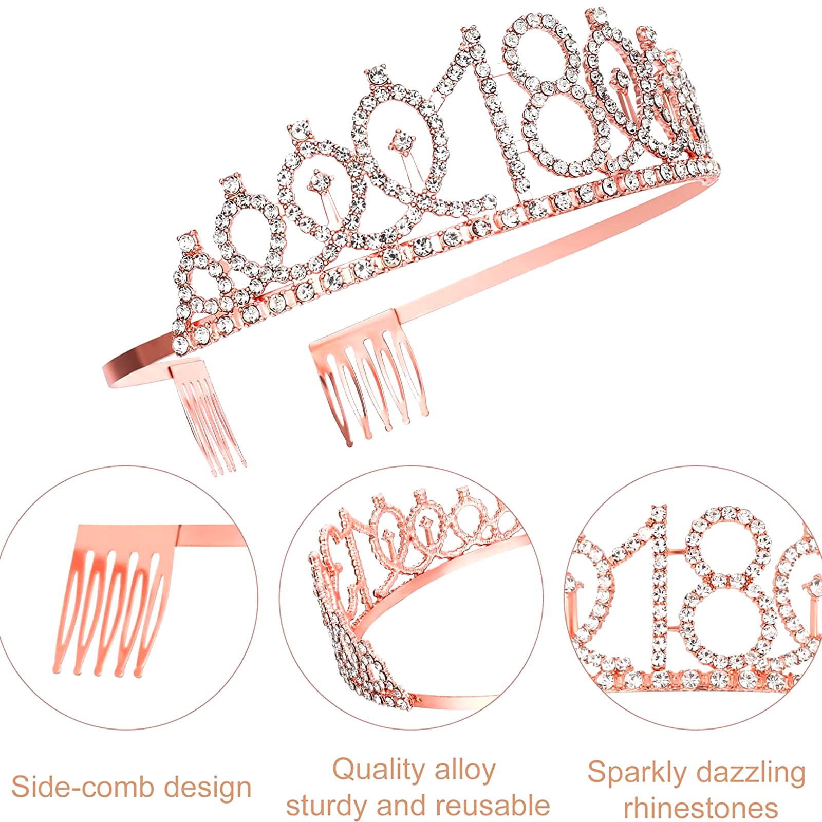 【Elegant Tiara】: The 18th birthday crown headband is made of quality alloy and shiny rhinestones, rose gold color highlights elegance. Crown with combs that make sure it can grip the hair more tightly for fitting girls.