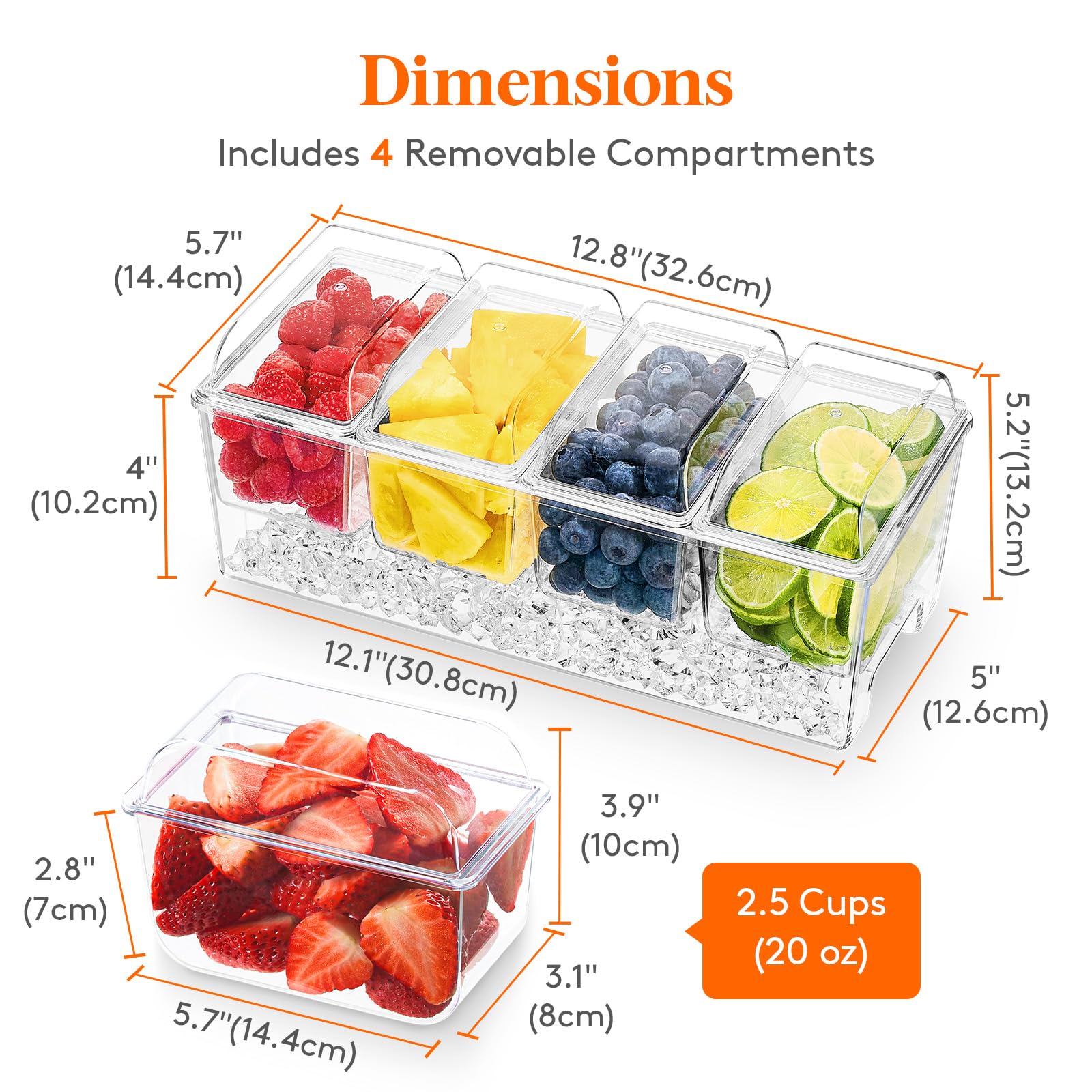Large Capacity: The chilled serving tray measures 12.8 × 5.7 × 5.2 inches and has four removable compartments; Each compartment with a lid is 5.7 × 3.1 × 3.9 inches, holds about 2.5 cups (20 oz), and can be easily detached for individual use