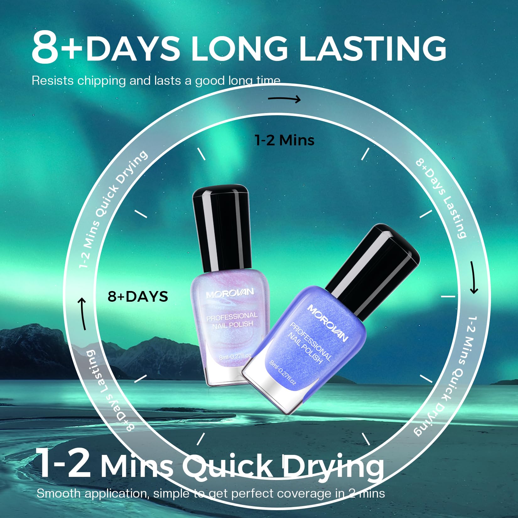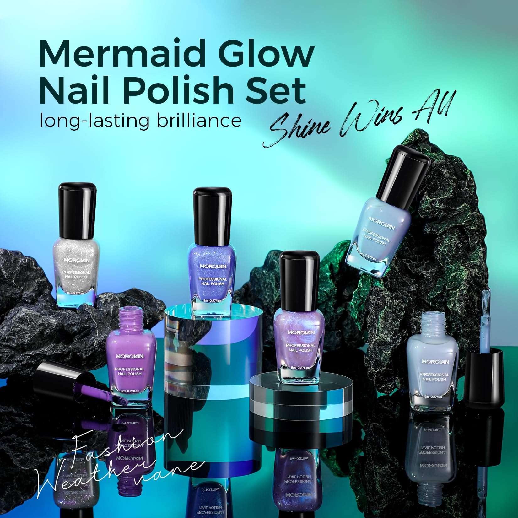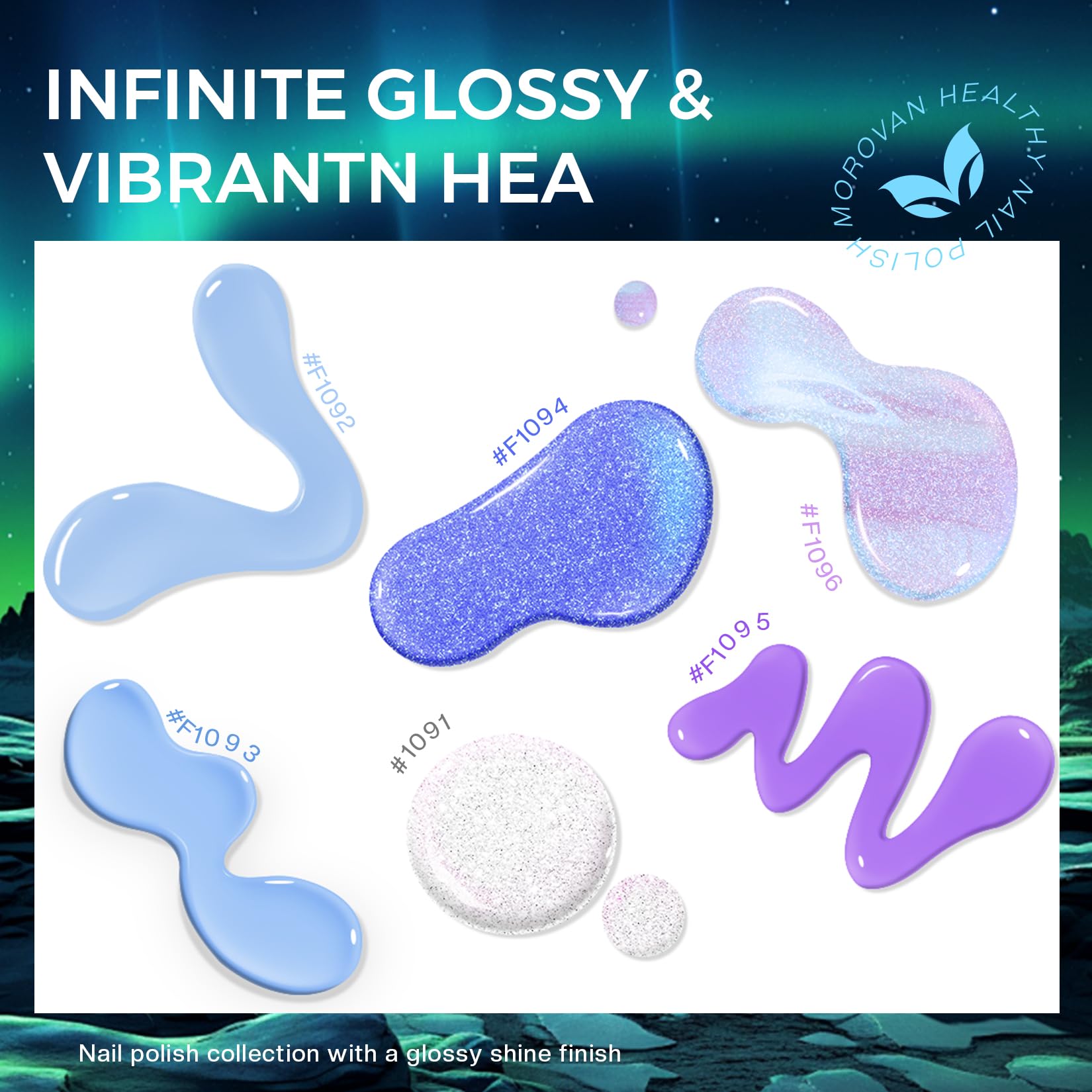 Morovan Purple nail Polish Set: This nail polish set has 6 blue-purple shimmer pearl shadesβmatte blue crushed diamond, star purple liquid gold, deep sea iridescence, etc. Loaded with fine pearl particles and glitter, this nail polish set offers one-stroke full coverage, a starry translucent pearlescent finish.