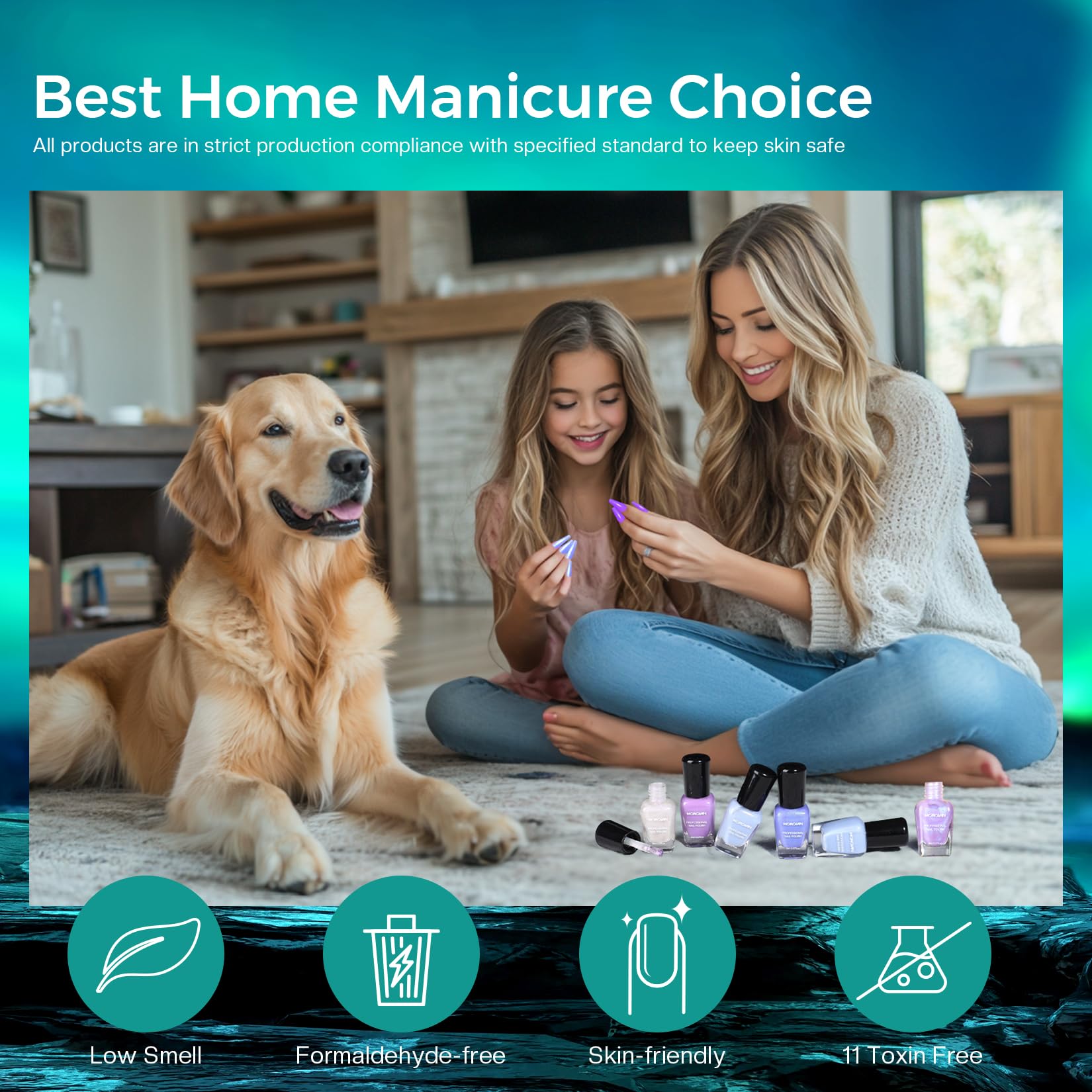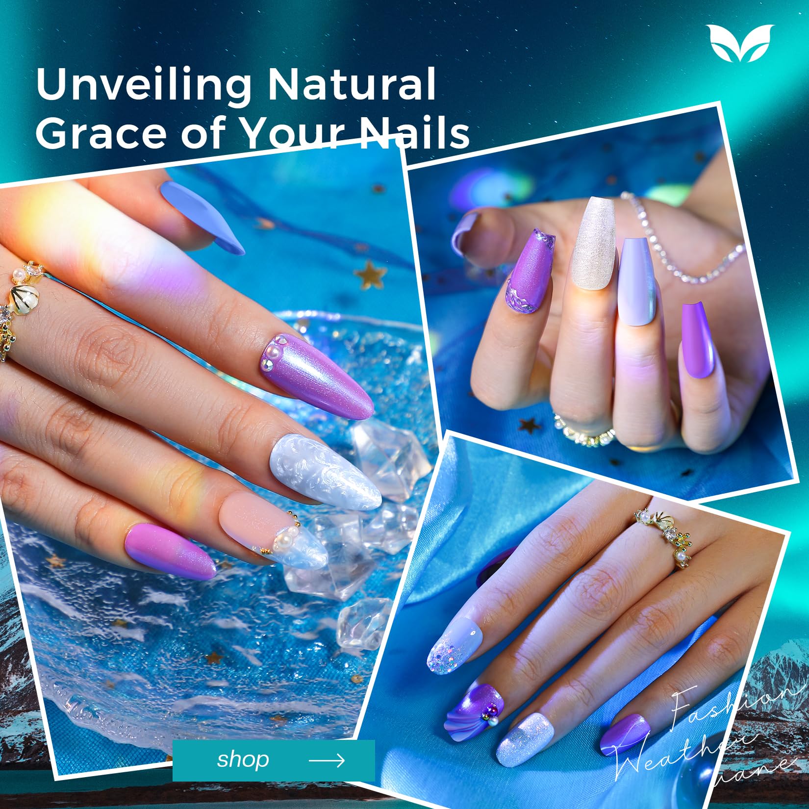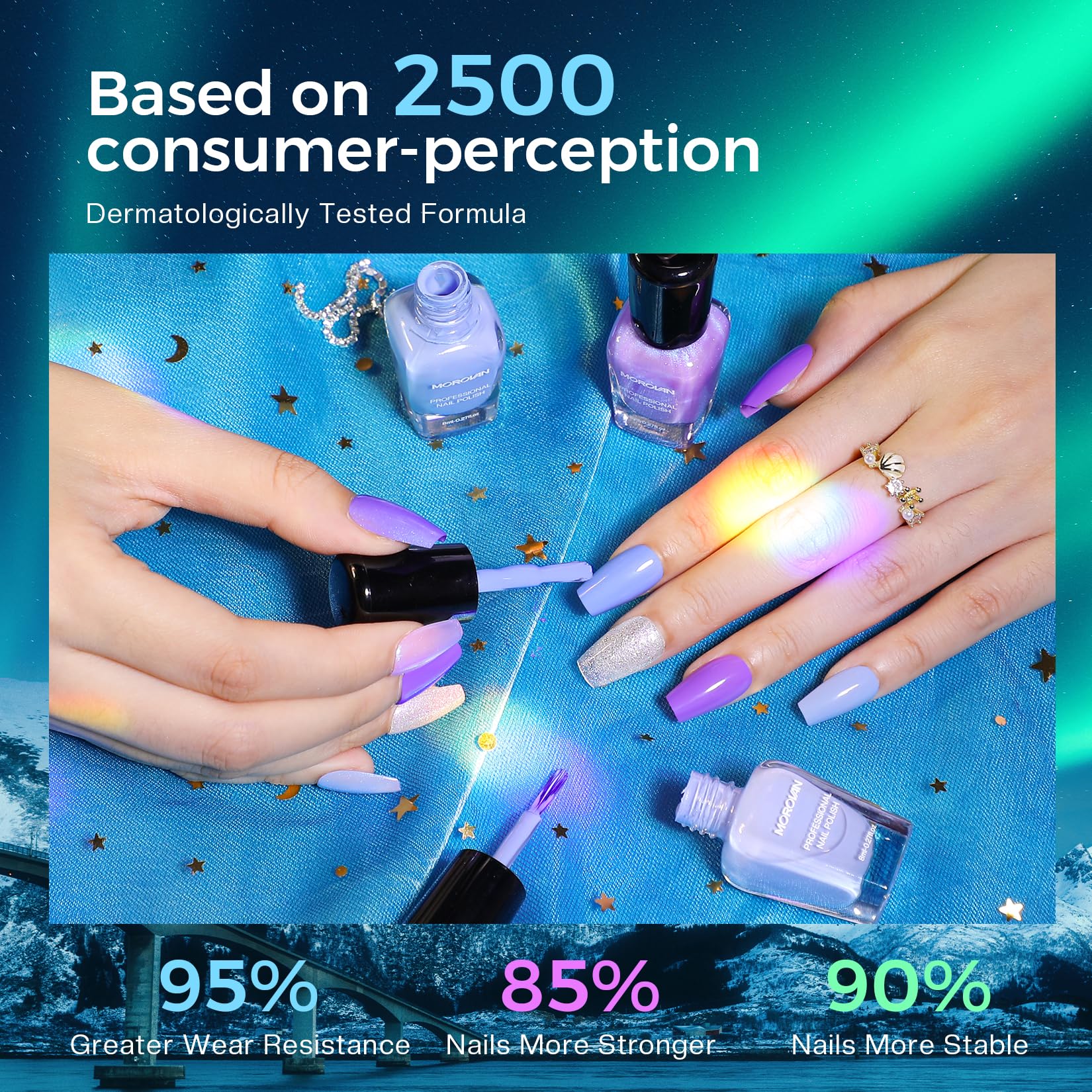 Morovan Purple nail Polish Set: This nail polish set has 6 blue-purple shimmer pearl shadesβmatte blue crushed diamond, star purple liquid gold, deep sea iridescence, etc. Loaded with fine pearl particles and glitter, this nail polish set offers one-stroke full coverage, a starry translucent pearlescent finish.