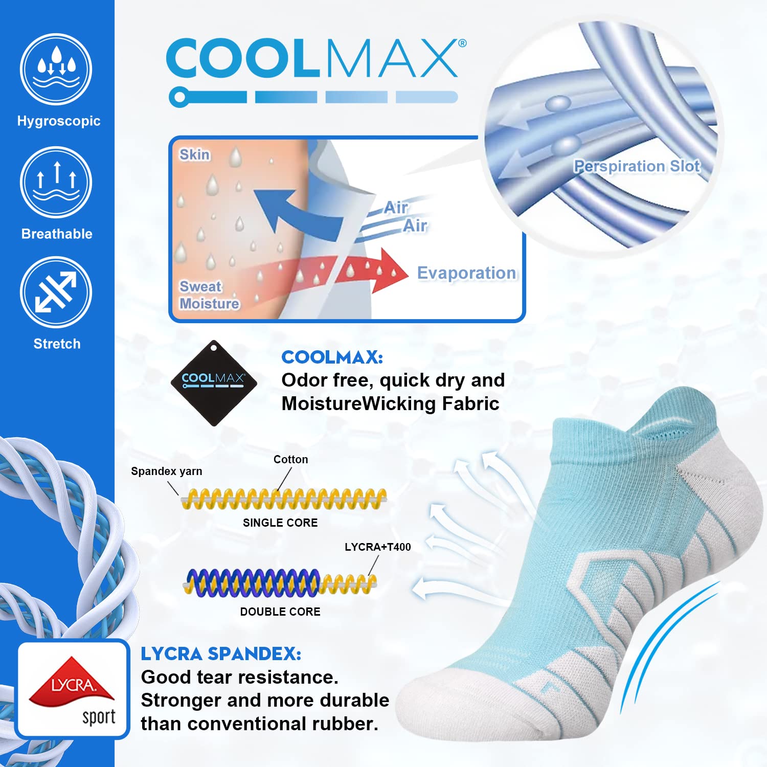 Moisture Wicking Socks - The running socks are made of high quality moisture control and quick dry CoolMax fiber. The great moisture wicking and comfort keeps your feet dry, feeling cool and fresh, helps prevent odor, prevents the risk of Athlete’s foot and blisters