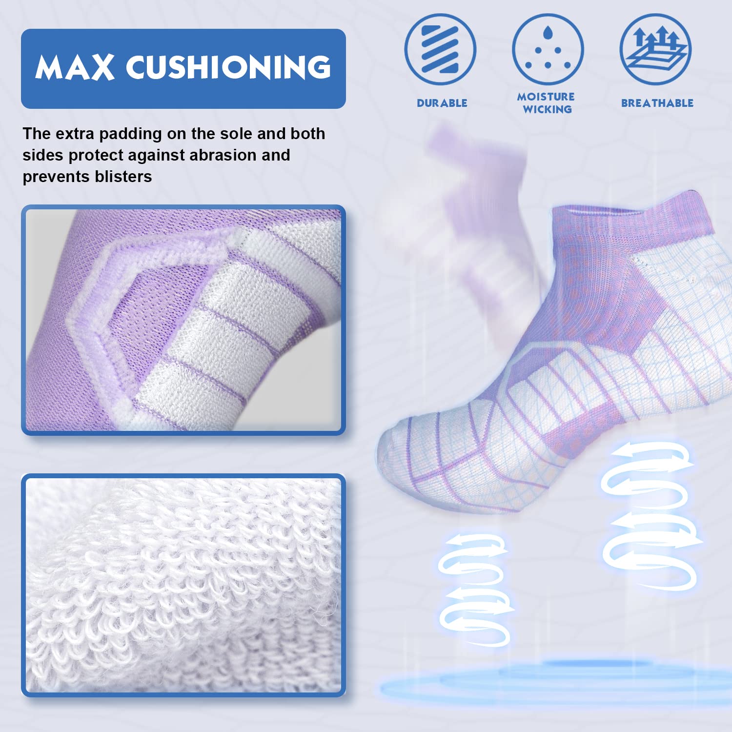 Max cushion padded socks: With full cushioning around your foot, these low cut socks are designed to help your feet feel great and avoid blisters, foot pain, and other discomfort with maximum protection