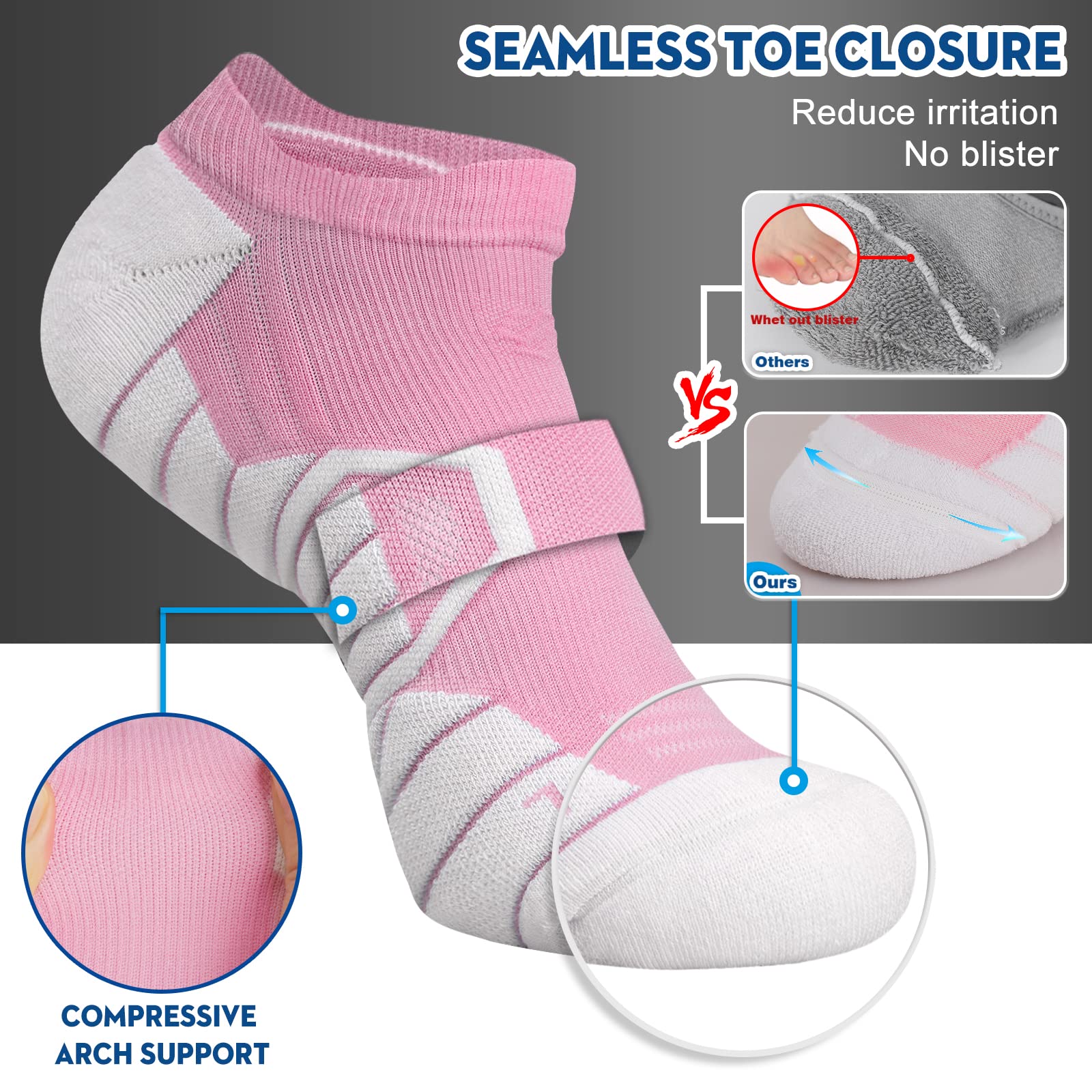 Seamless socks: These womens athletic socks are designed without a seam inside the end of the sock that might irritate sensitive toes. Seamless toe-closure free your feet and toes from restriction, making this the perfect sport socks