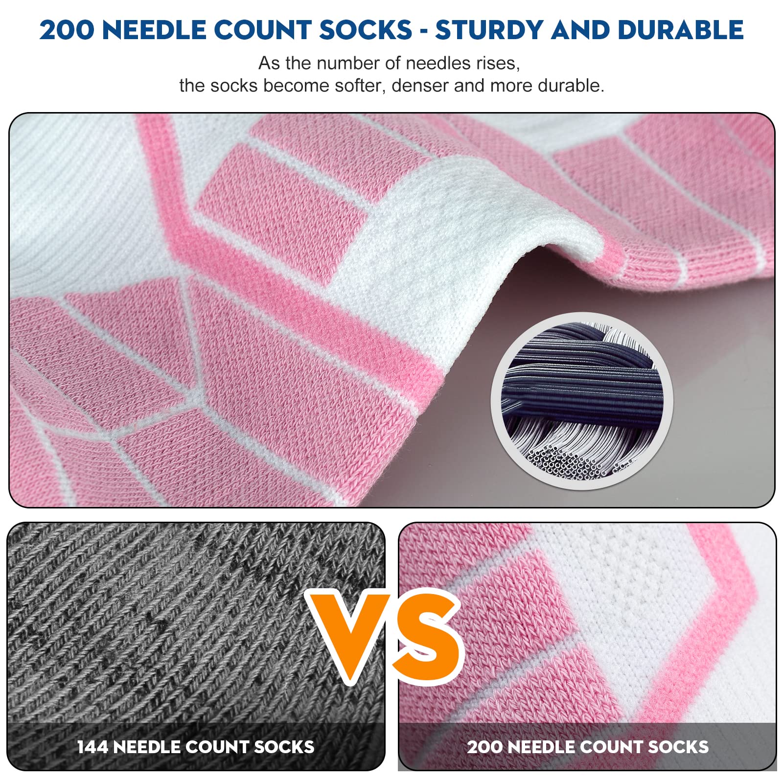 Durable and soft: We use 200 Needle count machines to make the sports socks while most of the brand only go up to 144 needle. With the number of the needles increases, the socks become softer, denser and more durable. Other runner socks get holes after the first couple of washes but these will last you a long time