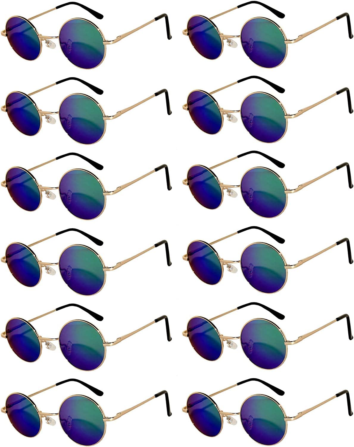 12 Pack Round Retro Vintage Blue-Green Mirror Lens Sunglasses Gold Metal Frame OWL.These party glasses are available in different colors, Blue-Green, Purple, Blue, Yellow, Red , Pink, Silver, Smoke. Box of 12 glasses of the assorted colors and models. Lens in Poly, frame AC.