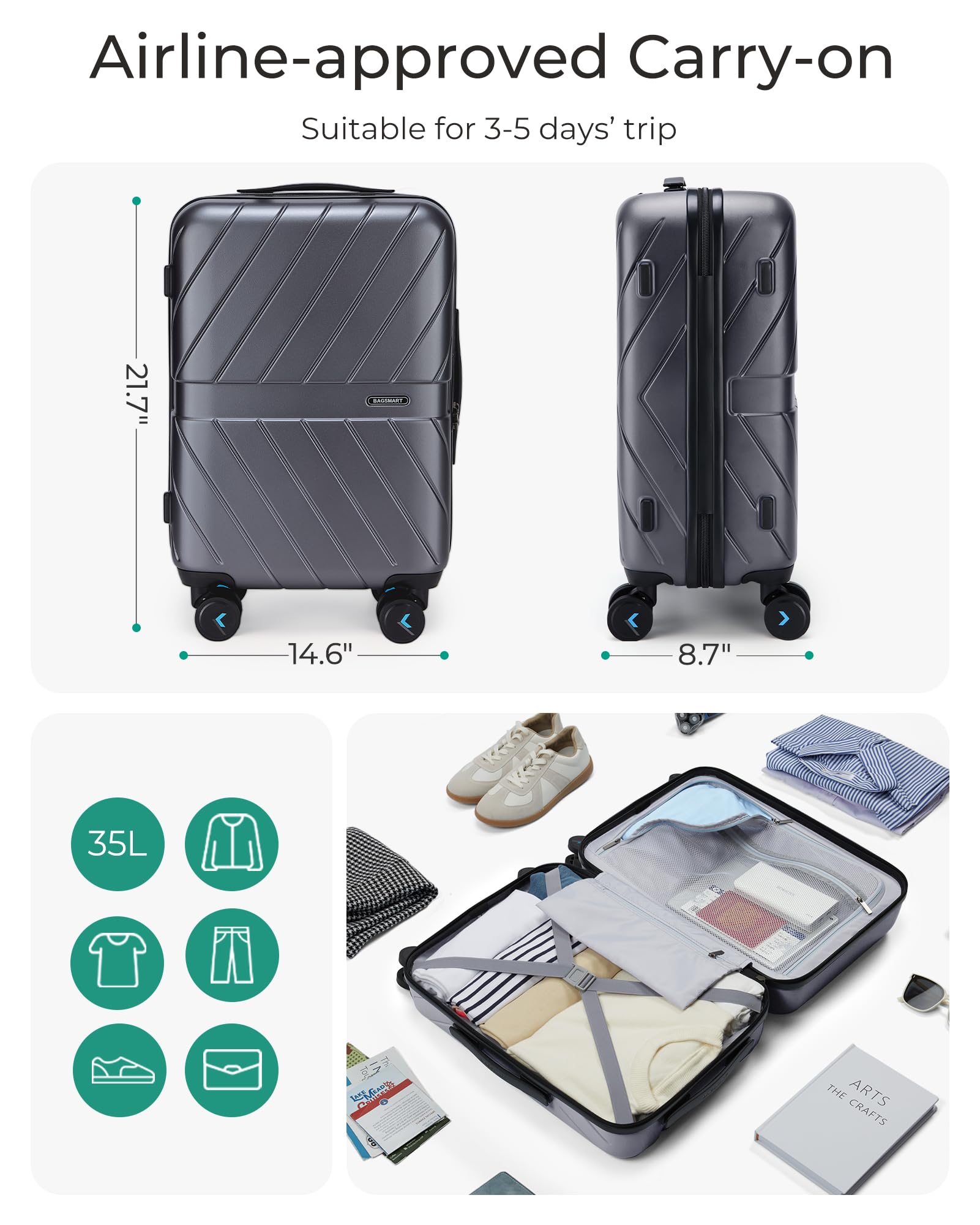 Room For More: BAGSMART hard case suitcase is designed to fit more into your trip. The 2 main compartments of travel luggage with compression cross straps store all your clothes and belongings and keep clothing wrinkle-free, items neatly in place. Individual built-in small pocket is for small items. Generously sized, thoughtfully placed designs maximize every inch of storage, meaning you can get more out of every trip with your carry-on.