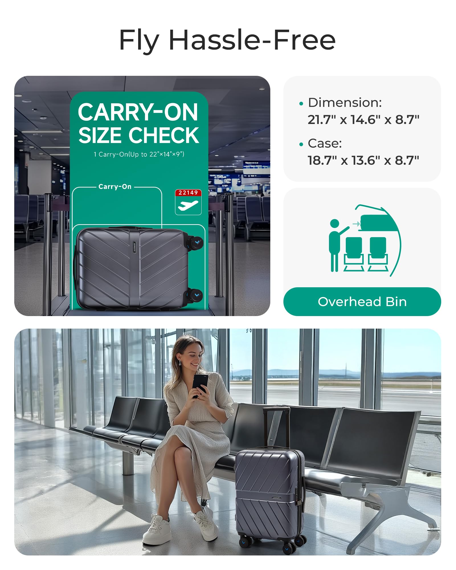Airline Approved Luggage: Dimensions: 21.7 x 14 x 8.7 in (wheel and handle height included). Volume: 35 L. Weight: 6.39 lbs. The 20" carry-on luggage size is designed to meet the airline requirements for most major airlines as a carry-on suitcase that can be placed in the overhead bin of almost any flight, anywhere in the world. No more paying for temporary consignments.