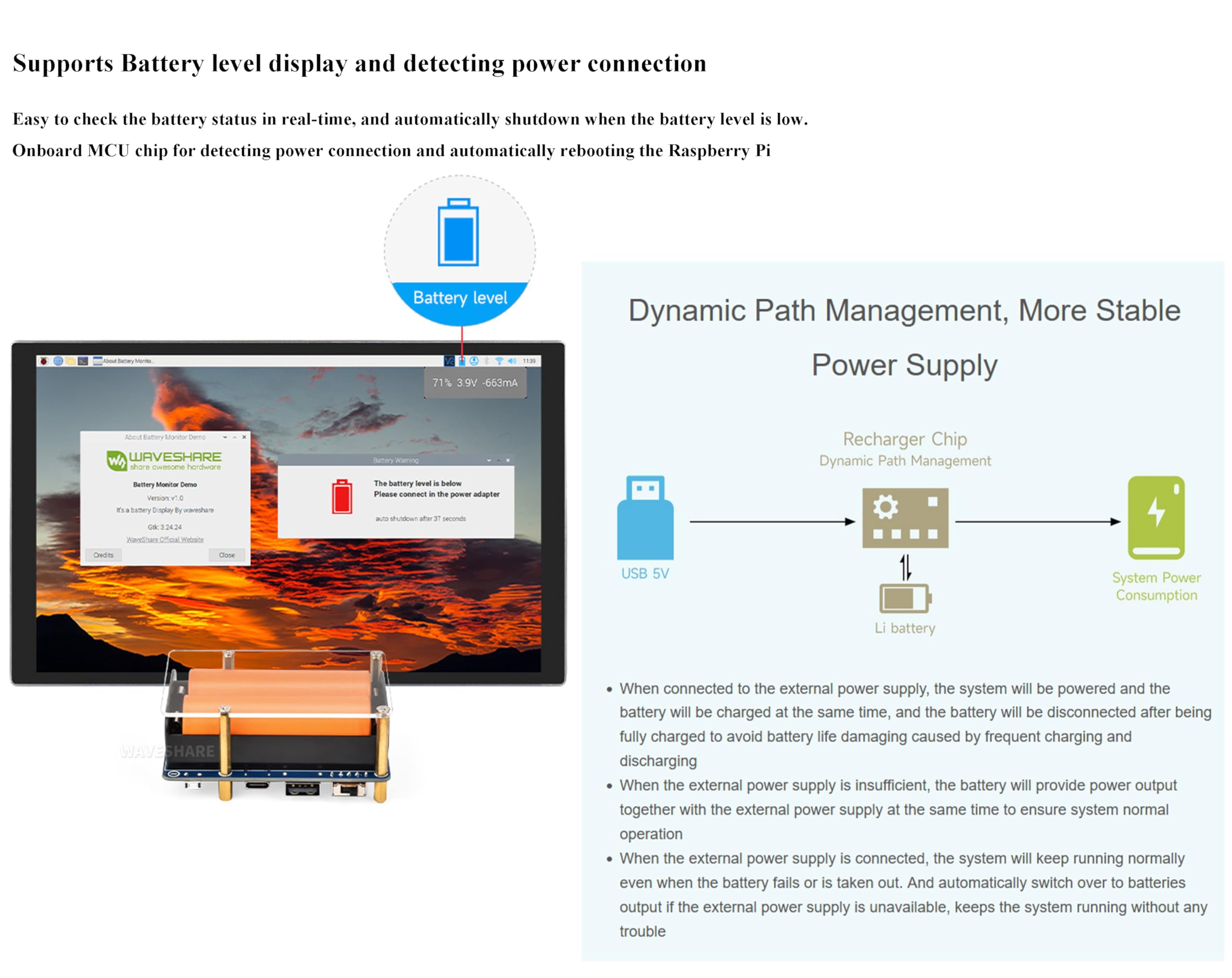 Supports ba-tte--ry level display and detecting power connection: Easy to check the ba-tte--ry status in real-time, and automatically shutdown when the ba-tte--ry level is low. Onboard MCU chip for detecting power connection and automatically rebooting the Raspberry Pi