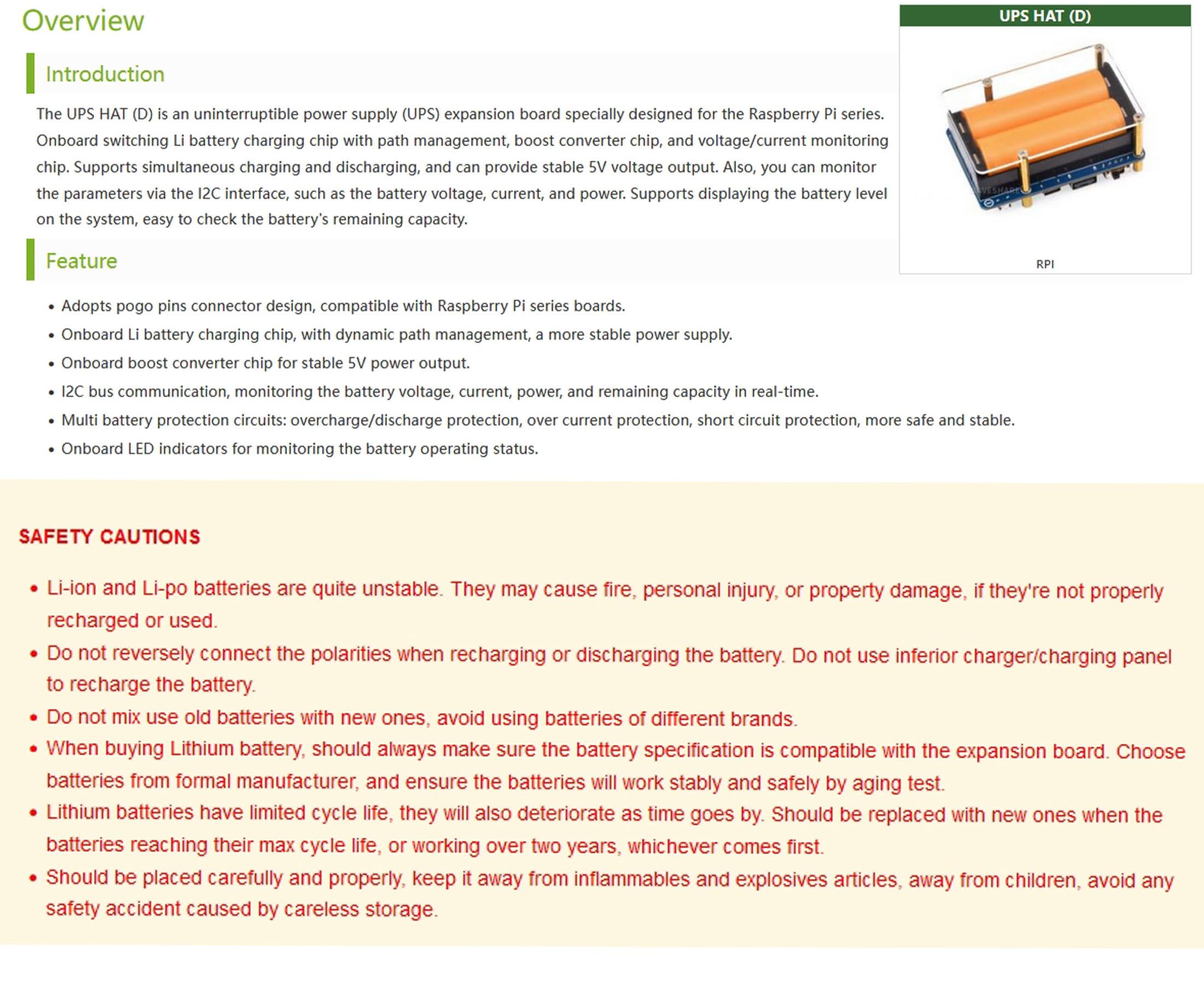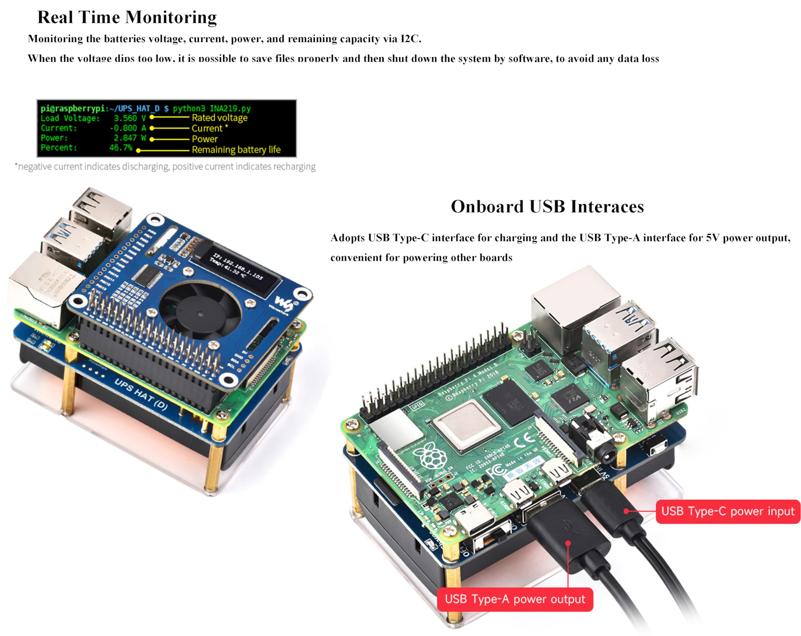 Real time monitoring: Monitoring the ba-tte--ries voltage, current, power, and remaining capacity via I2C. When the voltage dips too low, it is possible to save files properly and then shut down the system by software, to avoid any data loss