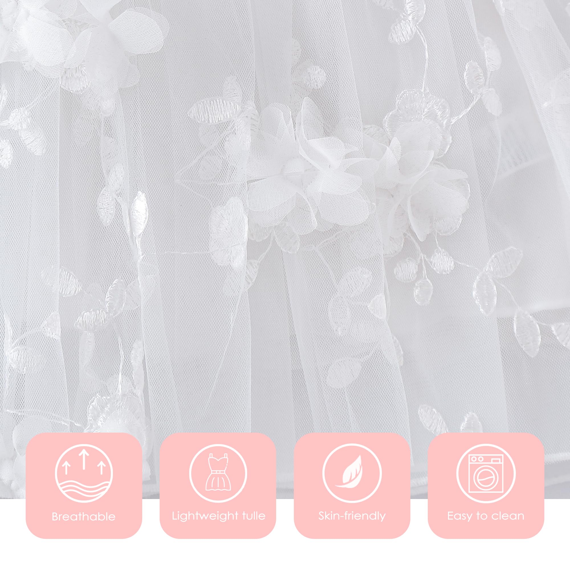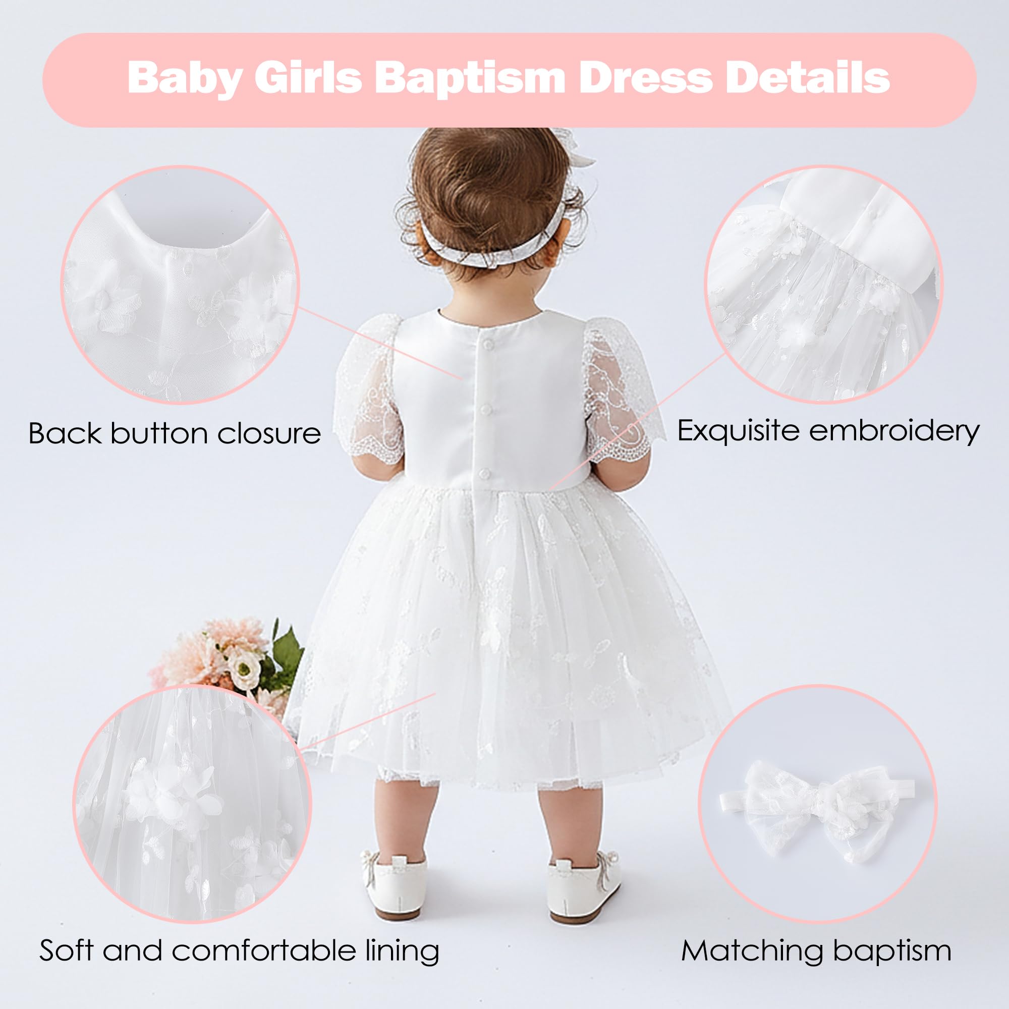 Lace White Dress Design: Exquisite flower embroidery, elastic cuffs, rear snap-up design for easy dressing, baptism dresses for baby girls dedication wedding dresses,bring your girls comfortable wearing.