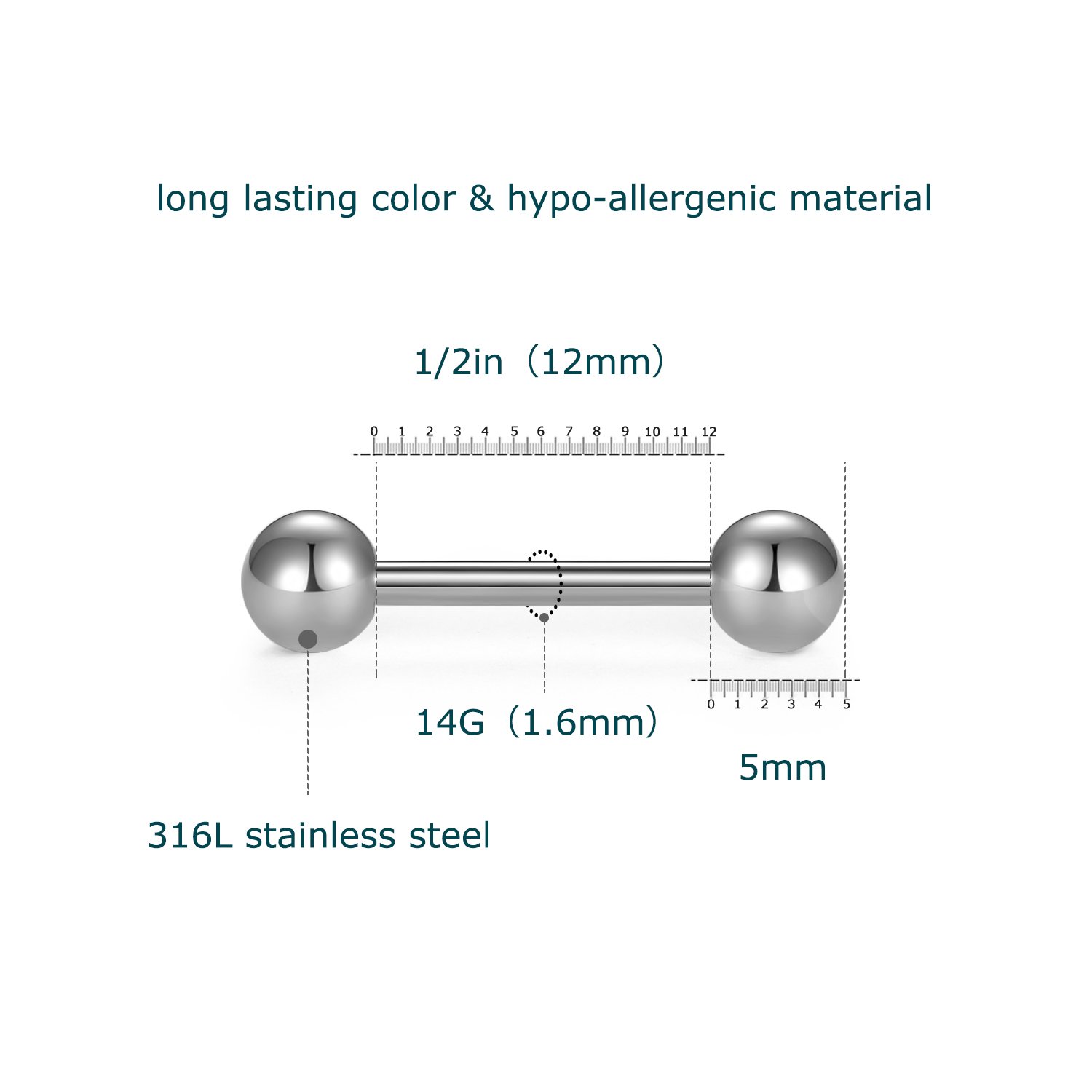 Size: 14G gauge (1.6mm), Bar length: 12mm (1/2 inch), Ball diameter: 5mm