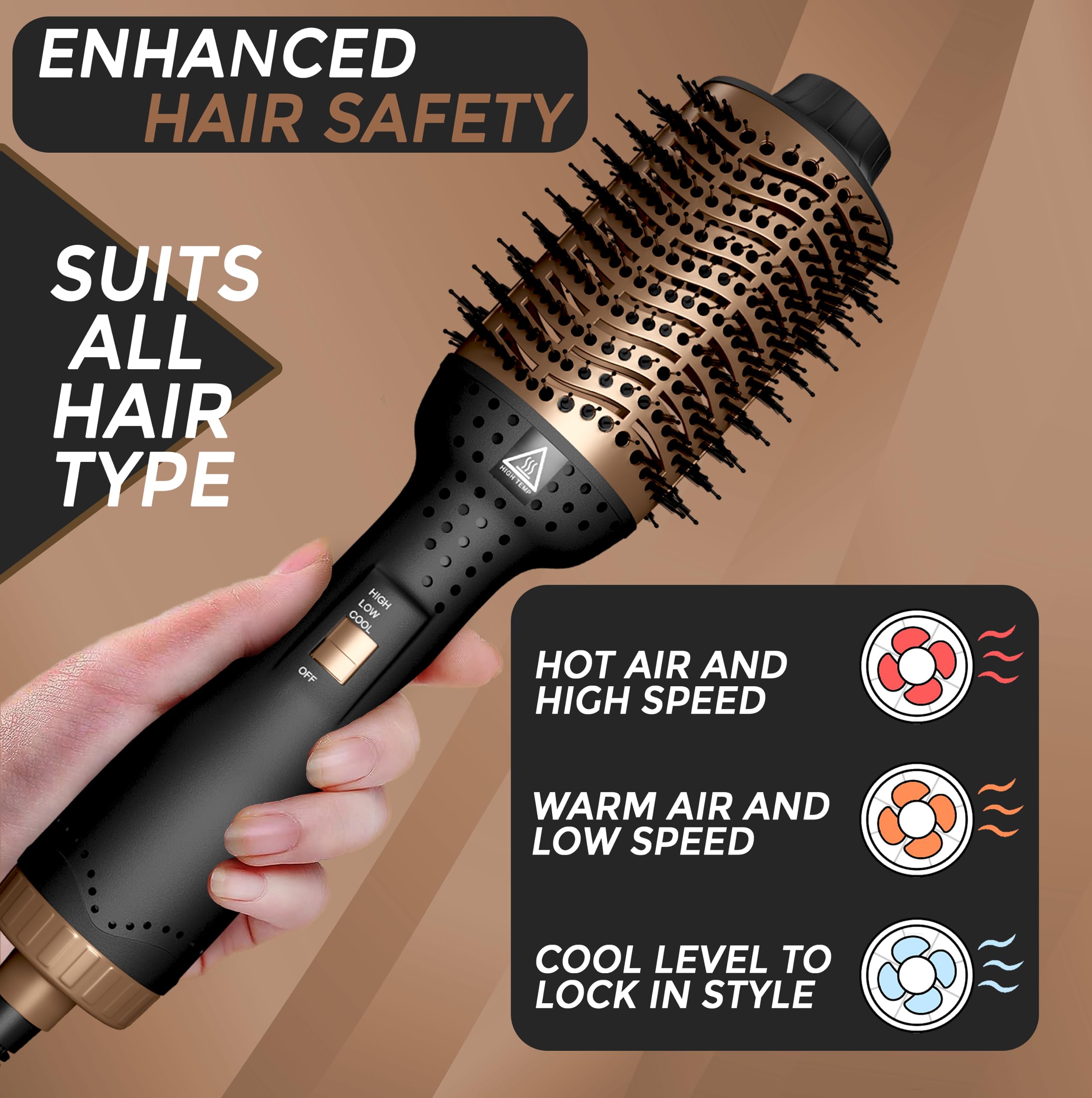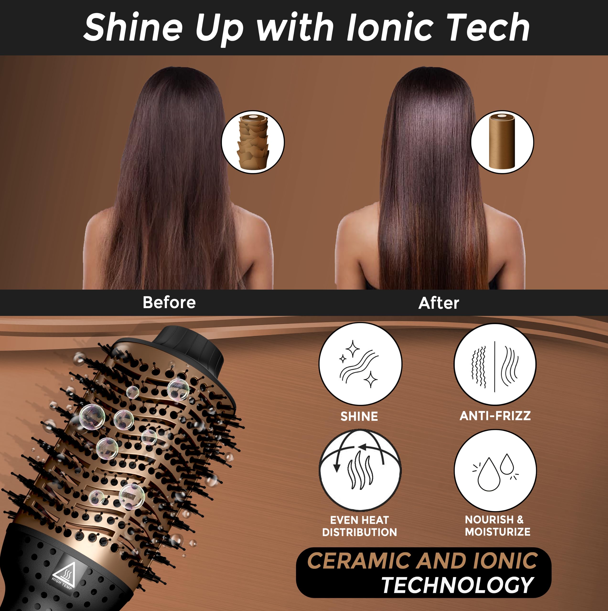 [ADVANCED IONIC TECHNOLOGY]: Experience less frizz and more shine with our ionic technology, which reduces static and flyaways. The IYASA Blow Dryer Brush seals in moisture, leaving your hair silky-smooth and healthy-looking with every use.