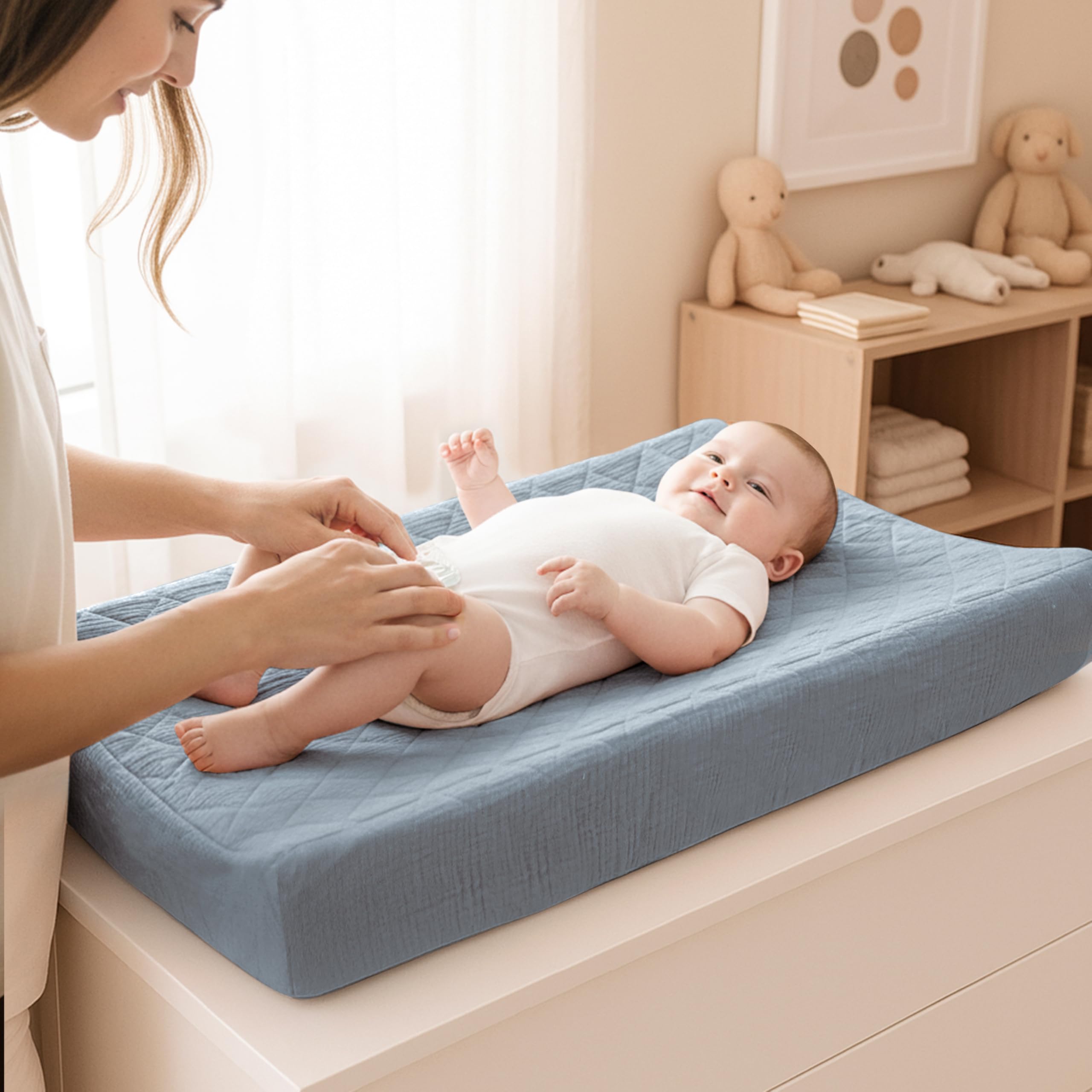 Quilted and Soft Fabric: Our changing pad cover consists of three layers: the top layer is made of 100% cotton (muslin), which is soft and absorbent; the middle layer is quilted with soft padding to ensure coziness and comfort; and the bottom layer is made of 100% waterproof polyester to protect the pad from wetting. Our unique design provides a comfortable touch for your baby while ensuring waterproof functionality, making our changing pad soft and perfect for delicate baby skin