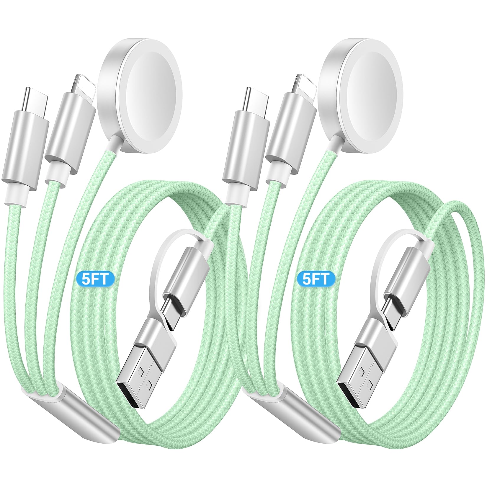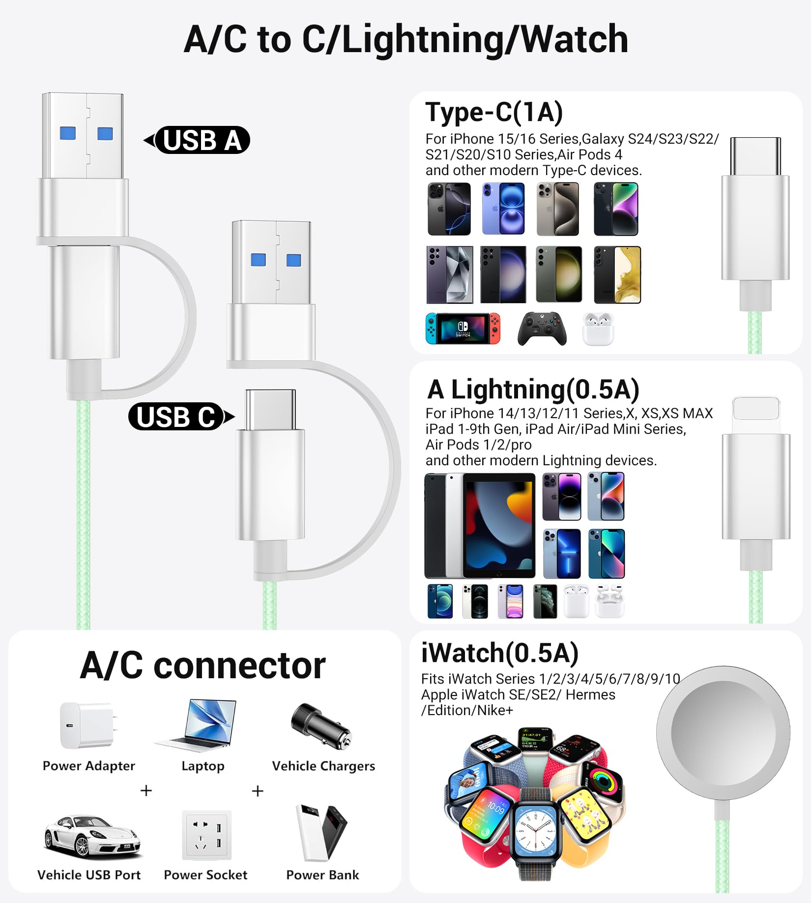 【2-Pack & 3-in-2 Multi Charging Cable】 3-in-2 multi charging cable provide 6 charging modes (USB-C/A for Apple Watch charger, Lightning, and Type-C),which compatible with all iWatch Ultra series 11/10/9/SE/8/7/6/5/4/3/2/1, compatible with iPhone 12-17/iPad (Lightning/USB-C).A portable travel charger for multiple devices,designed for simultaneous charging of multiple devices