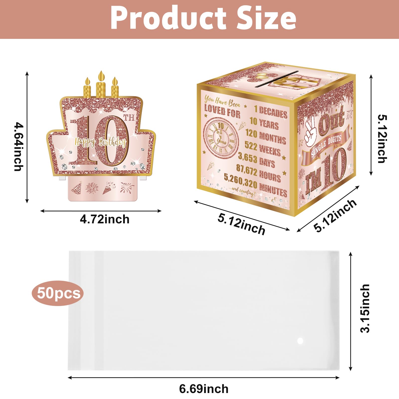 【10th Birthday Money Box】 Sturdy 5.12" x 5.12" x 5.12" money gift box with a pink rose gold design. 50 transparent bags (6.69" x 3.15") fit US dollars (2.61" x 6.14") to meet DIY cash gift needs. Also, support was added to the box to make it more stable, 10th Birthday pull-out card with the number '10'