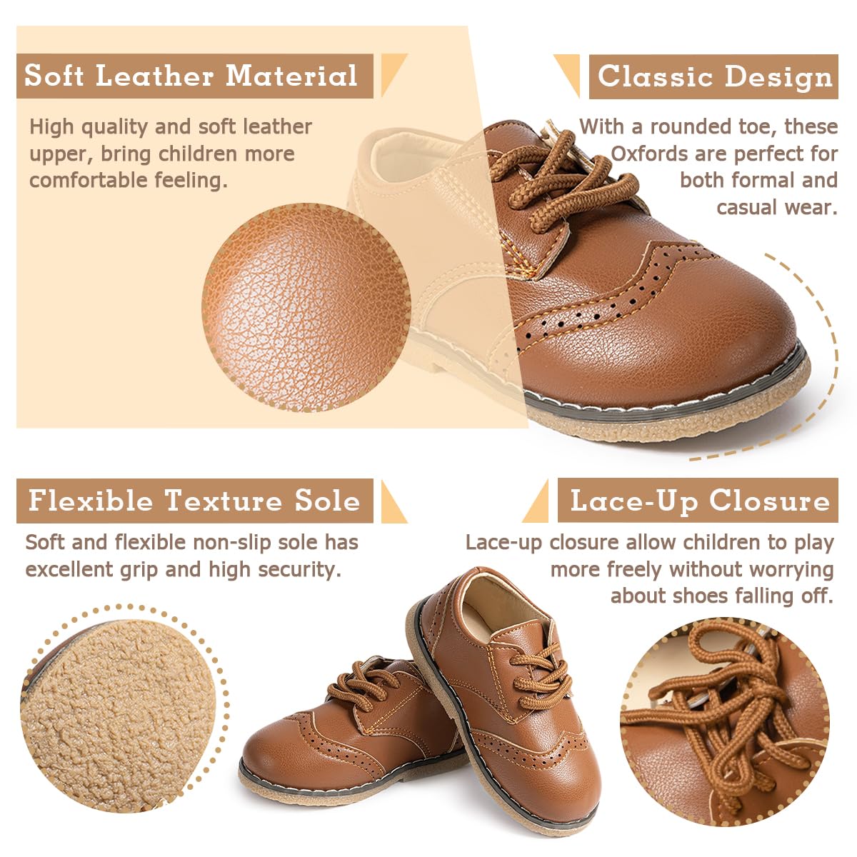 Comfortable Wear: The classic oxfords are designed with laces that can be adjusted to be as loose or tight as you like. Wide rounded toe allows room for your childβs foot to move and grow, ensuring long term comfort