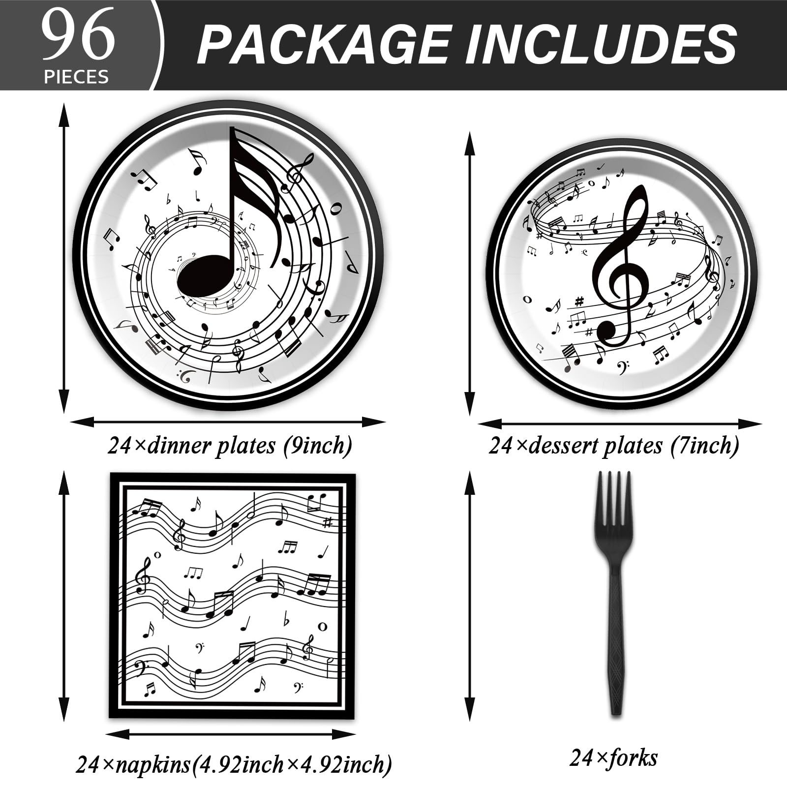 What you will get: These musical note tableware include a total of 96 pieces of disposable tableware.You will get 24×9 inches musical note style plates, 24×7 inches plates, 24×napkins and 24×black forks.