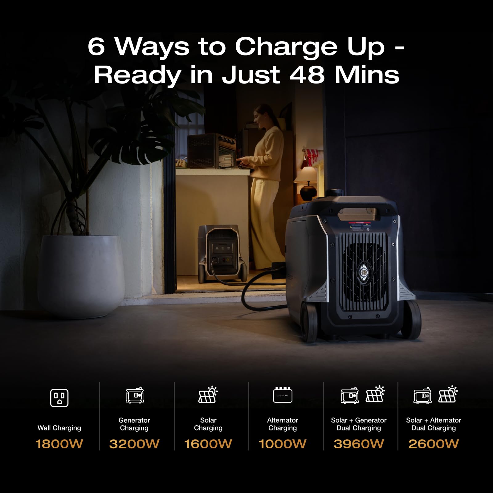 6 Ways to Charge Up. From home outlets to solar panels, car chargers, EV stations, generators, and the EcoFlow Smart Generator, DELTA 3 Ultra Plus offers unmatched flexibility. Reaching 80% in under an hour with X-Stream fast charging, you’re always ready for emergencies, travel, or off-grid living.