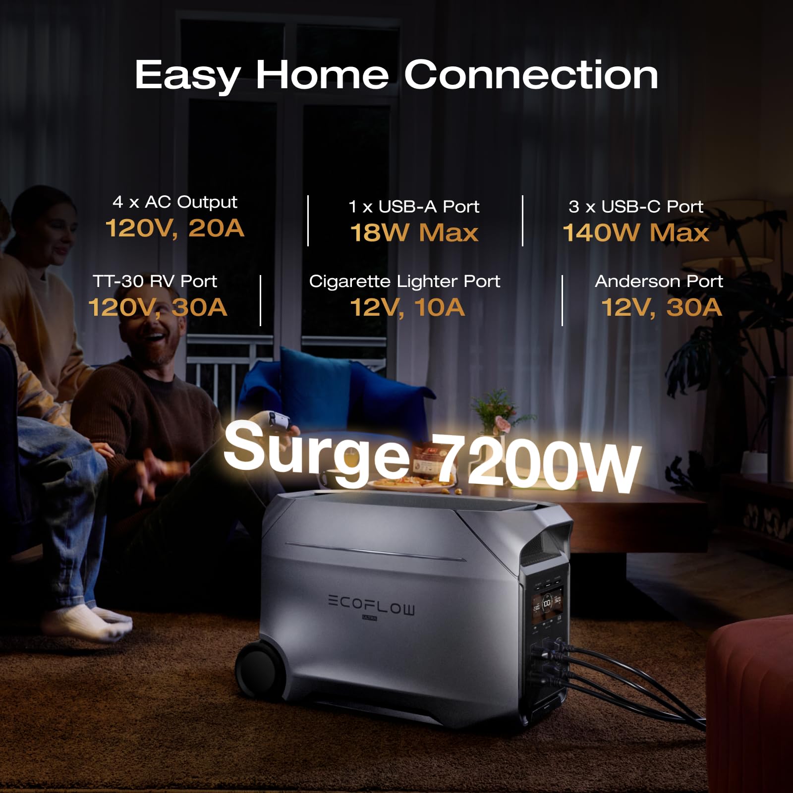 Built to Handle It All. Unleash 3600W of continuous power (surge 7200W) with X-Quiet 3.0 technology—strong enough for heavy-duty household appliances, power tools, and RV essentials. Whether it’s a blackout, camping trip, or daily use, DELTA 3 Ultra Plus ensures you’ll never be short on reliable power.