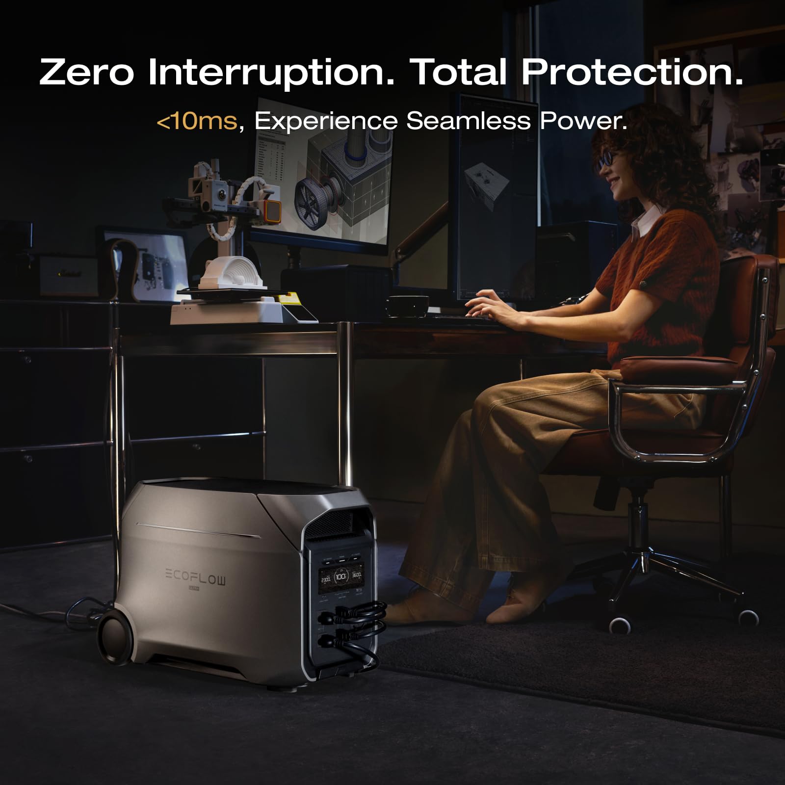 <10ms UPS for Uninterrupted Backup. Stay connected when it matters most. DELTA 3 Ultra Plus automatically switches to battery power in under 10 milliseconds, protecting sensitive devices like computers, medical equipment, and routers from sudden outages. No manual setup required—just seamless, instant peace of mind.