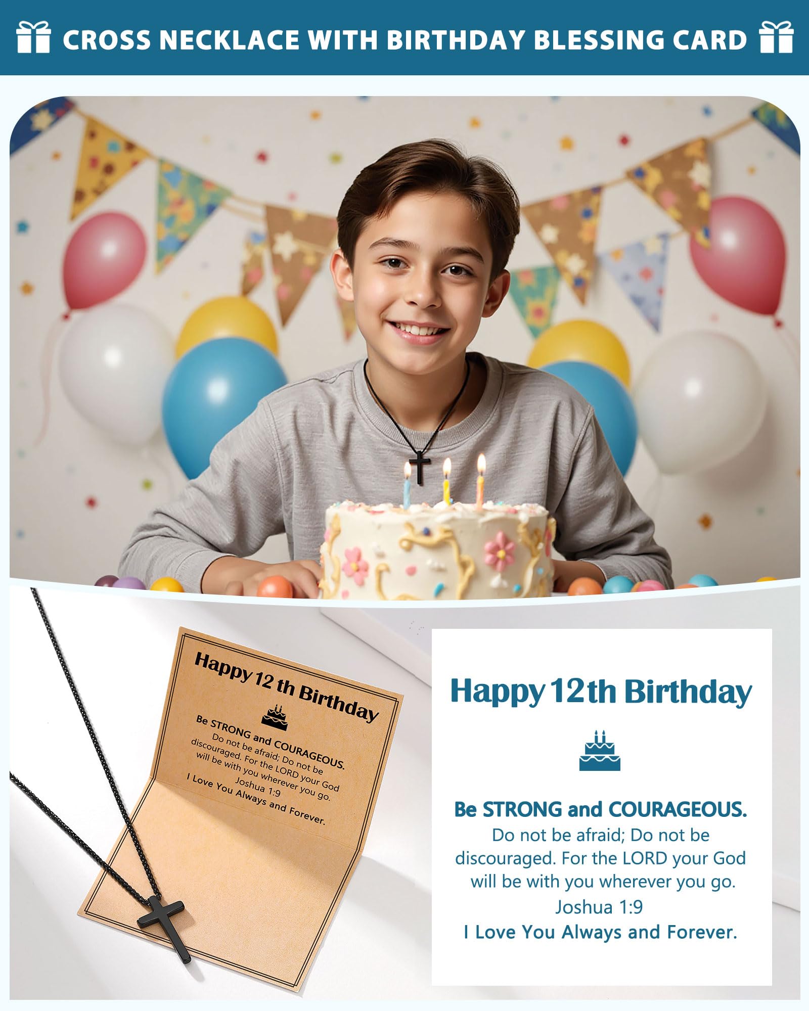 HAPPY BIRTHDAY CROSS NECKLACE: Celebrate the boy's birthday with a heartfelt Christian present. This black cross necklace carries a powerful blessing of courage, strength, and God's love