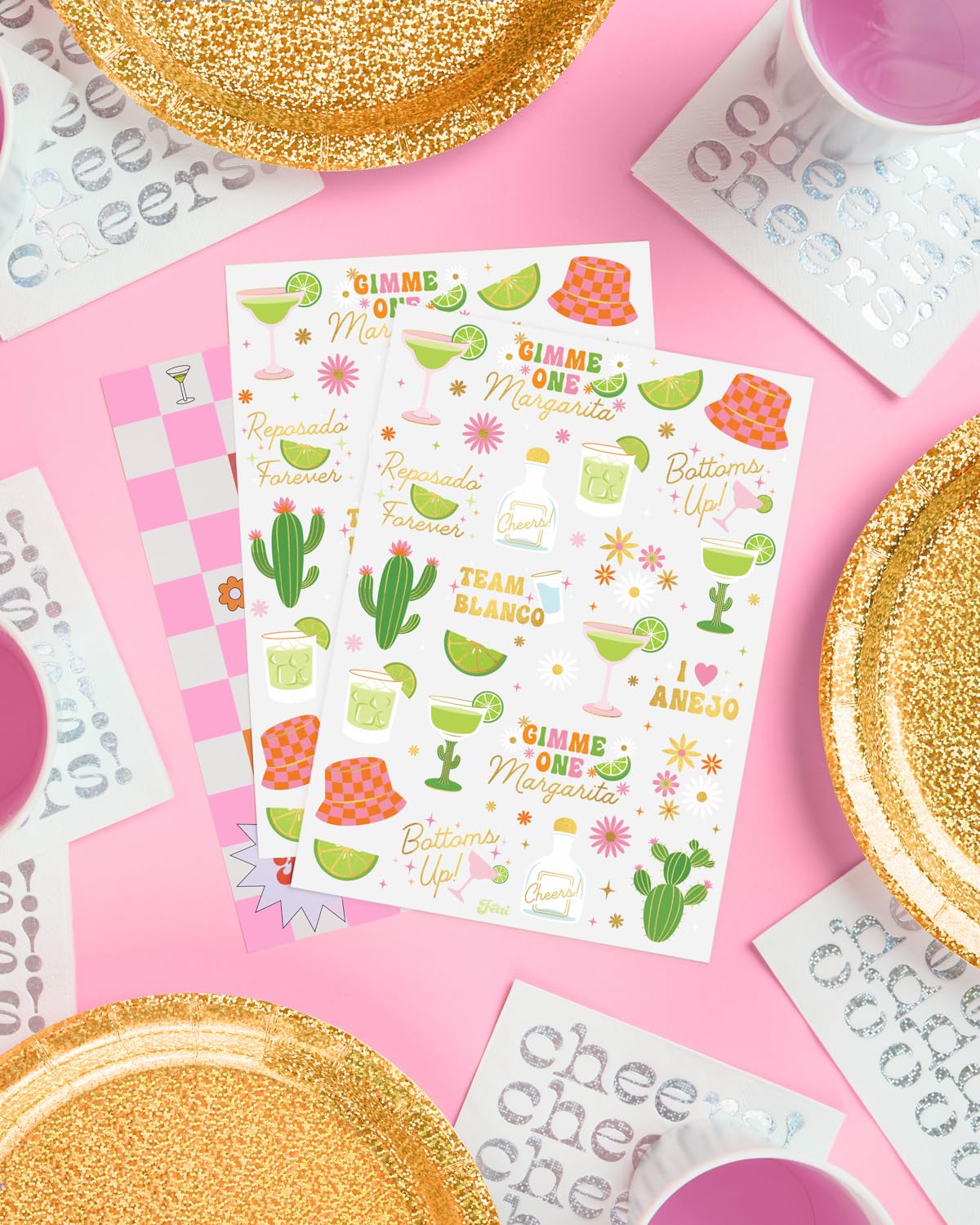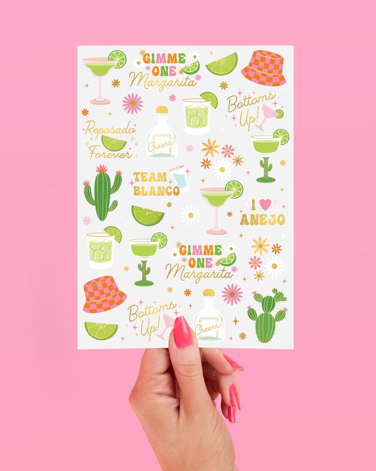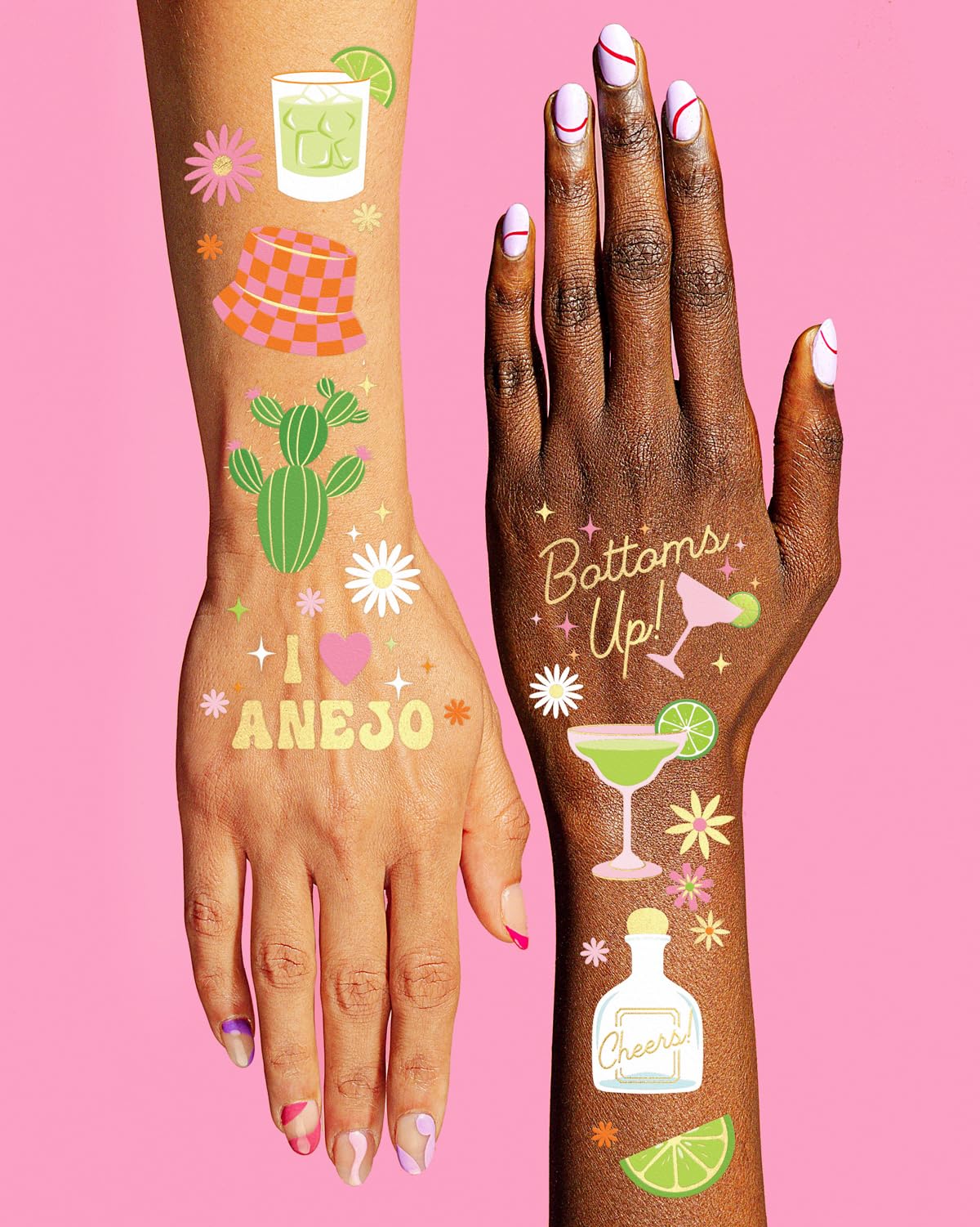 Get ready to add a little extra spice to your next celebration with these margarita-themed temporary tattoos! With 54 fun designs, including margaritas, cacti, limes, tequila, and vibrant flowers, these tattoos bring the fiesta to life. Each design is detailed in full color and accented with gold foil for that extra pop of flair. Perfect for bachelorette parties, birthdays, beach days, Cinco de Mayo, or any occasion that calls for a little fun. Ready to apply? Use our easy to follow instructions on the back of the tattoo sheet. Once applied, get ready to party day into night since these are long lasting, durable, and waterproof. So, are you ready to throw the coolest party of all time? We got you covered!