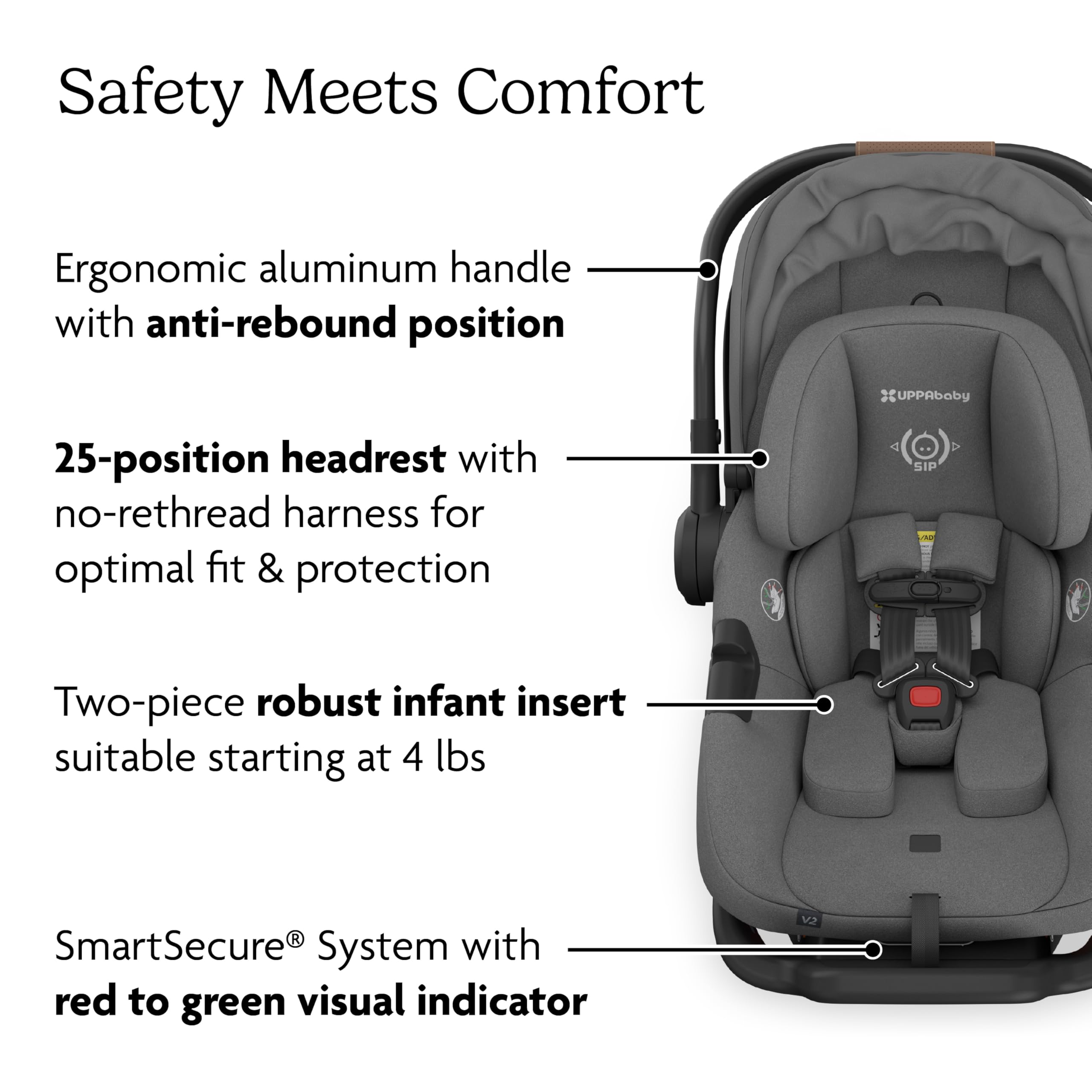 The Aria V2 Lightweight Infant Car Seat redefines on-the-go travel, weighing just 6 lbs, making it one of the lightest infant car seats available. Designed for safety, comfort, and convenience, it features SmartSecure® technology for quick and secure installation, an Anti-Rebound+ Panel and Load Leg for added stability, and advanced Side Impact Protection with energy-absorbing EPP foam. This rear-facing infant car seat grows with your child with a 25-position adjustable headrest and extra legroom for longer use, while the extra-large sun canopy, back panel ventilation, and included All-Weather FootCover keep baby cool, shaded, and comfortable in any season. The Aria V2 easily transforms into a travel system car seat, attaching directly to UPPAbaby Vista® and Cruz® strollers, with adapters available for Minu® and Ridge®, making it the ideal car seat and stroller combo for parents on the go. Parents will appreciate its ergonomic aluminum carry-handle, simple one-crotch buckle position, and easy-release base for stress-free transitions from car to stroller. With a slim 17-inch wide footprint to maximize backseat space, FAA certification for airplane use, machine-washable fabrics, and fire-retardant-free DualTech™ materials, the Aria V2 is the ultimate choice for families looking for a lightweight, travel-ready, newborn car seat that delivers uncompromising safety and everyday convenience.
