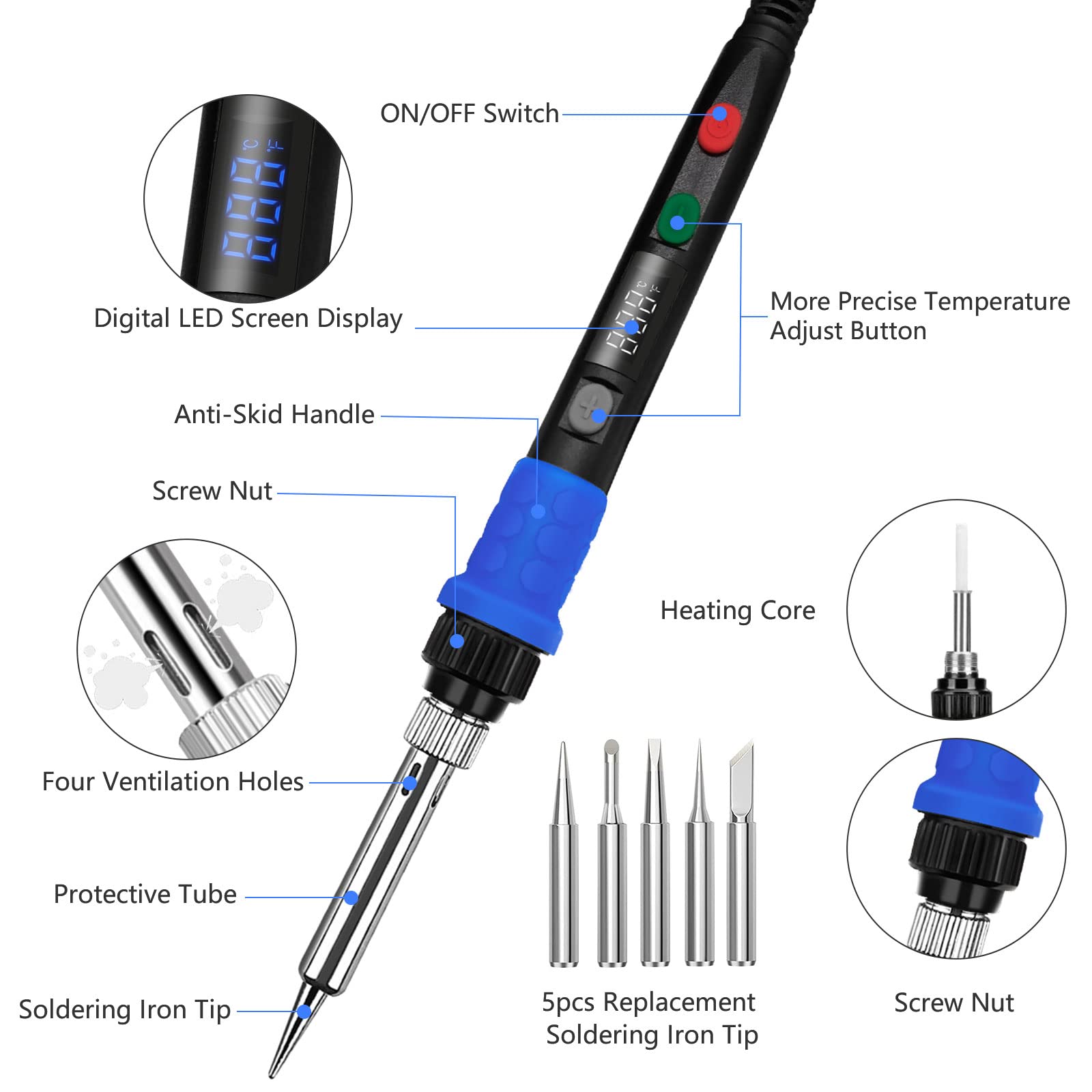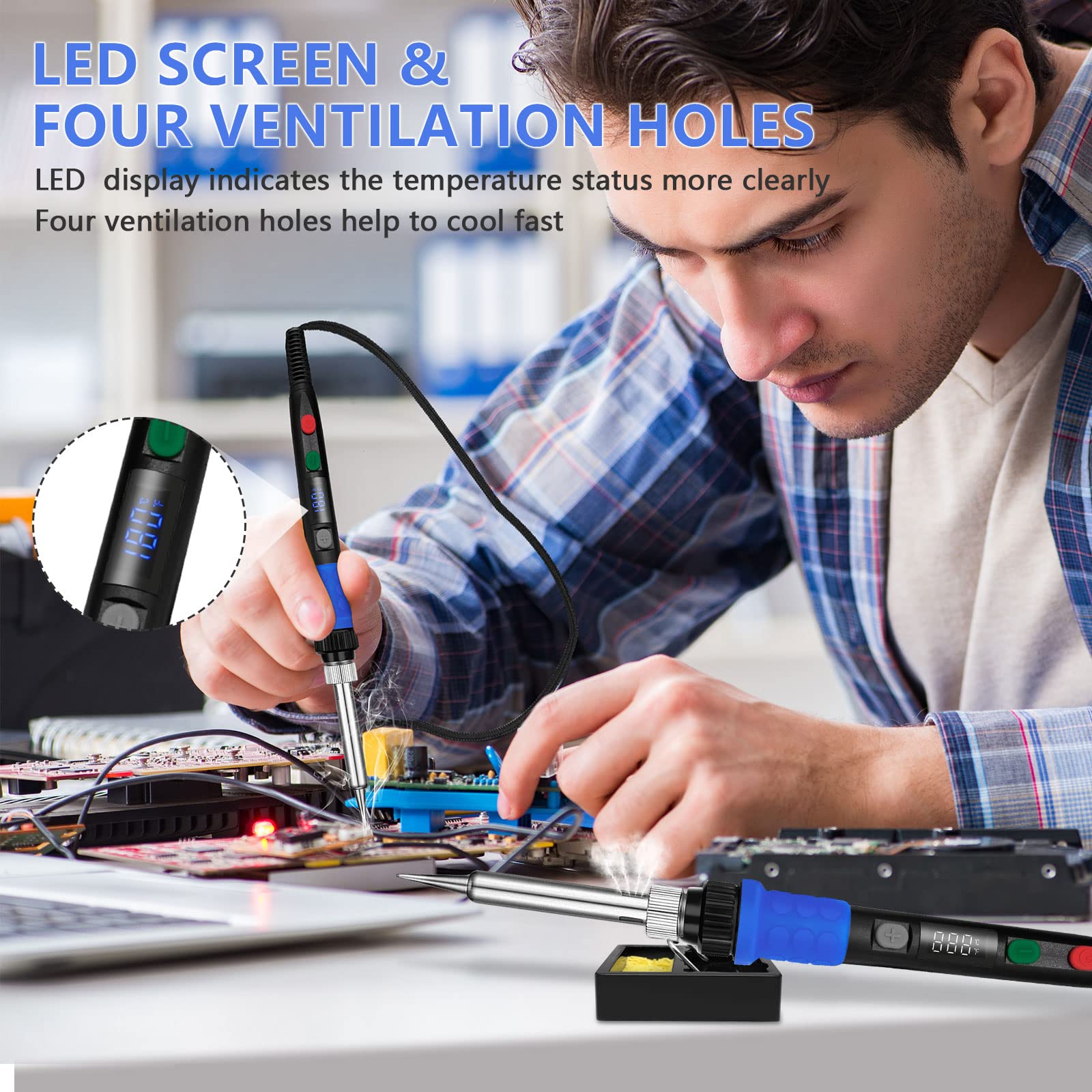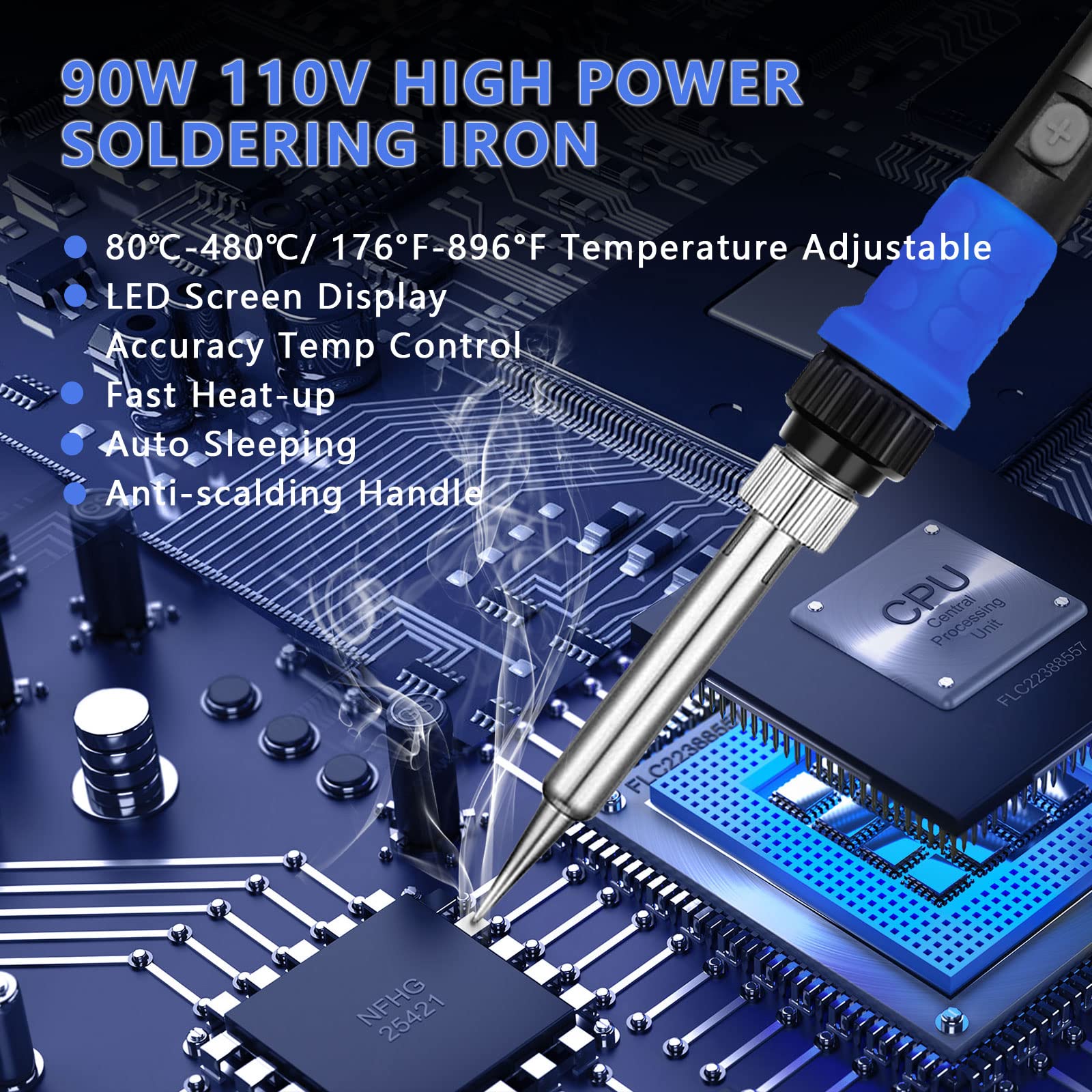 🔧 Upgraded Soldering Kit - The 90W 110V soldering iron uses a high-power advanced ceramic heating core, which heats up quickly within 20 seconds, allowing you to work faster. And our digital soldering iron has a non-slip silicone sheath, which is soft and comfortable to handle, allowing you to avoid scalding during operation