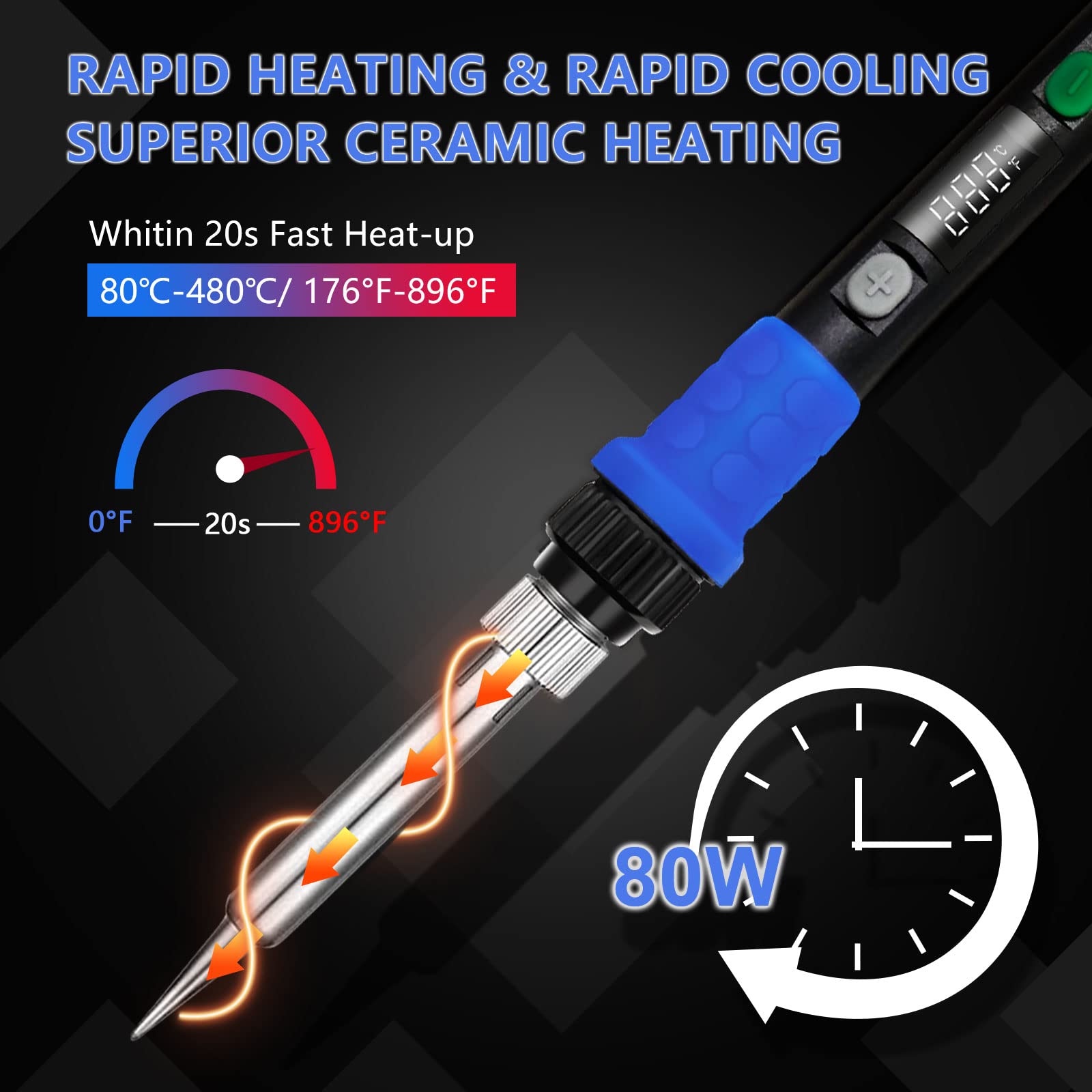 📌 LED Temp Display - The digital soldering iron with LED display, has precise temperature control, you can precisely adjust the temperature range 80℃-480℃/176℉-896℉. The ℃/°F can be switched at any time