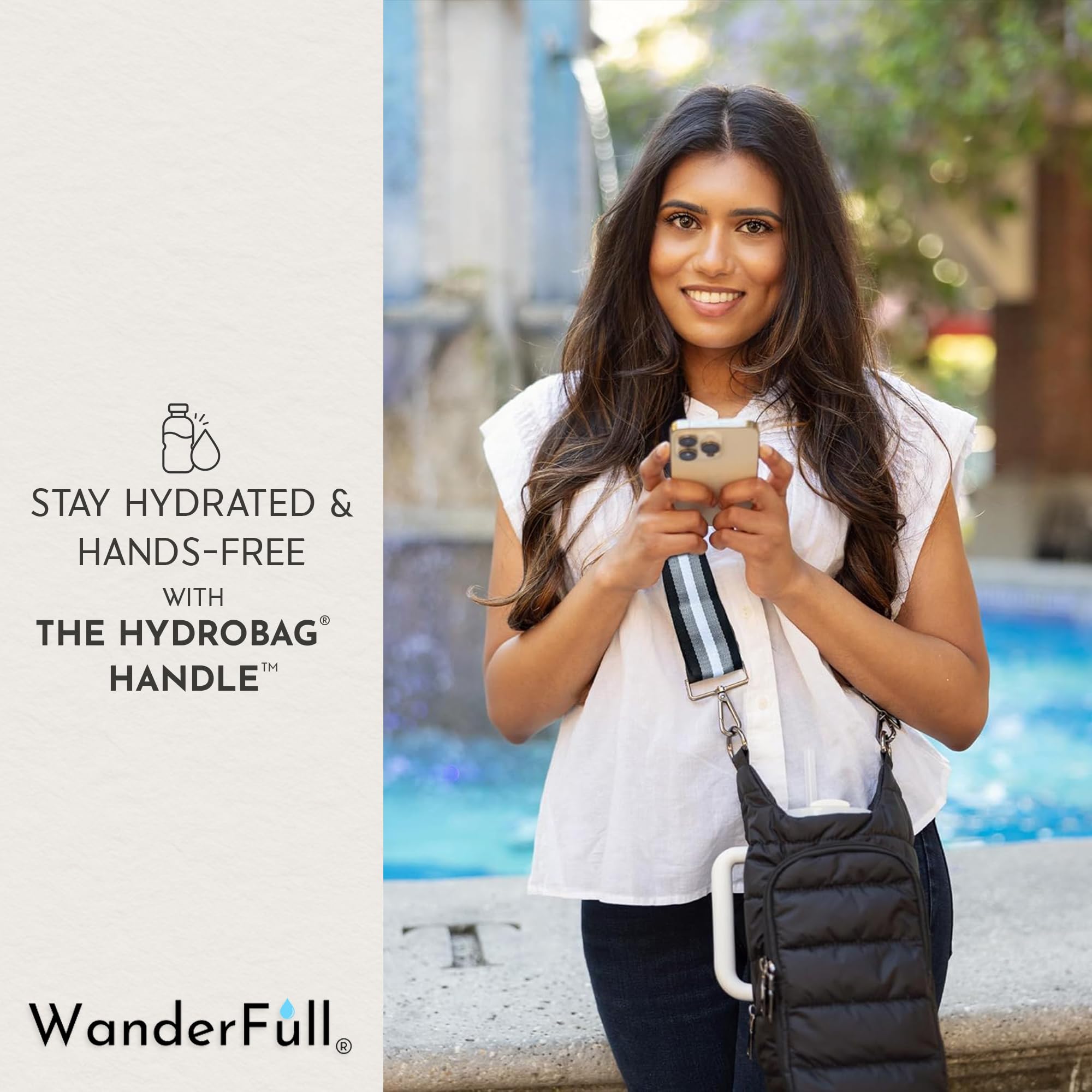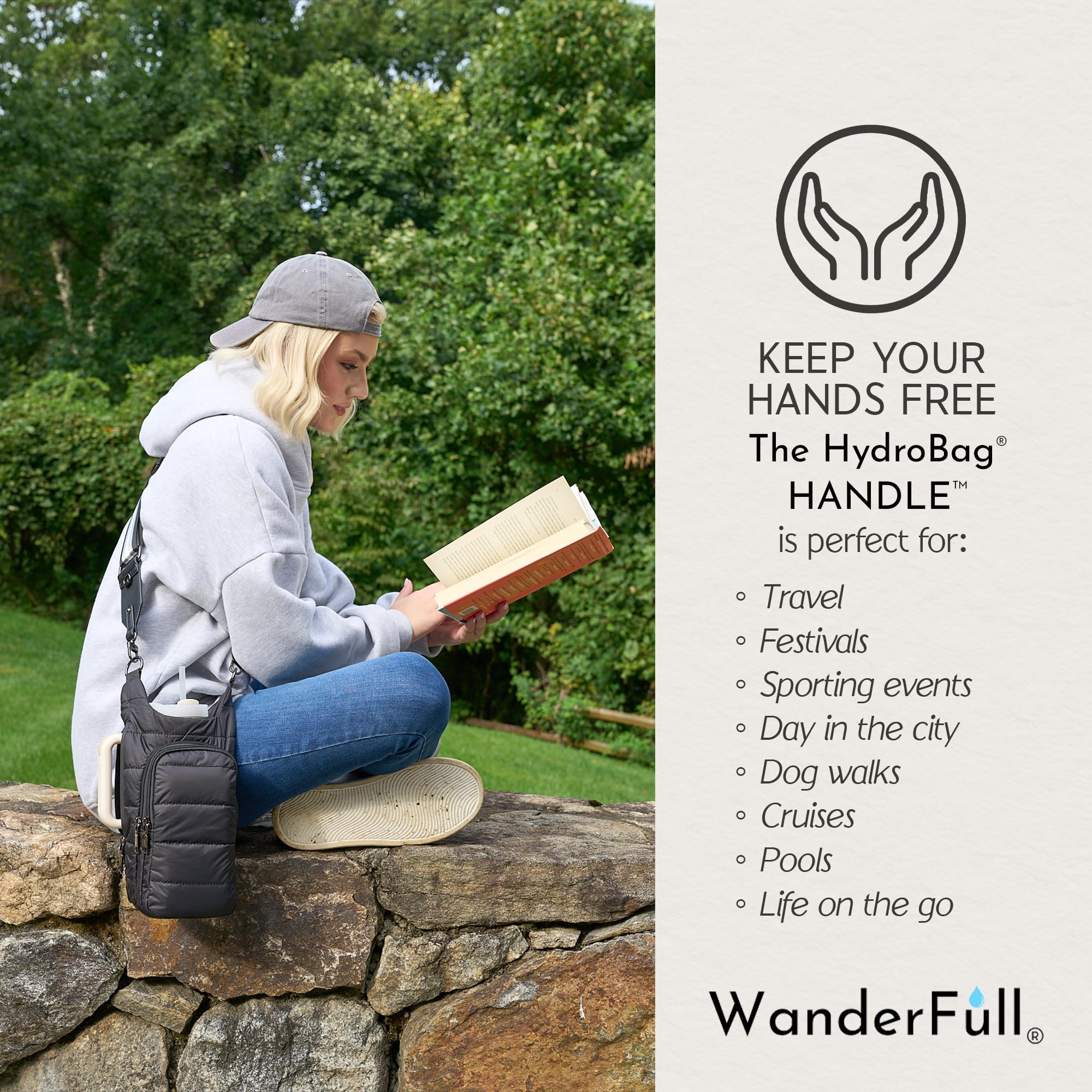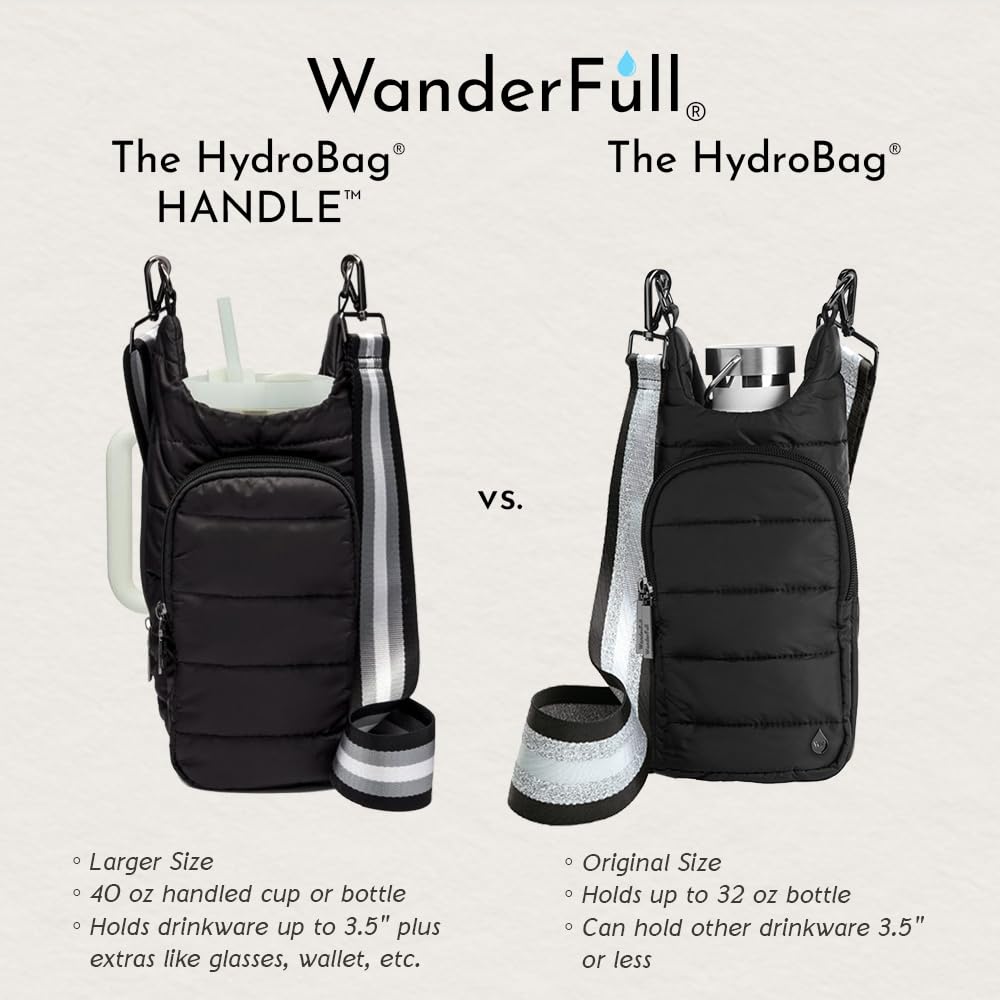 STAY HANDS-FREE & HYDRATED: Carry your bottle effortlessly with the patented WanderFull HydroBag HANDLE. Ideal for sightseeing, festivals, sports events, traveling, or walking the dog. Water bottle not included.
