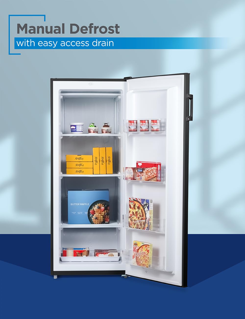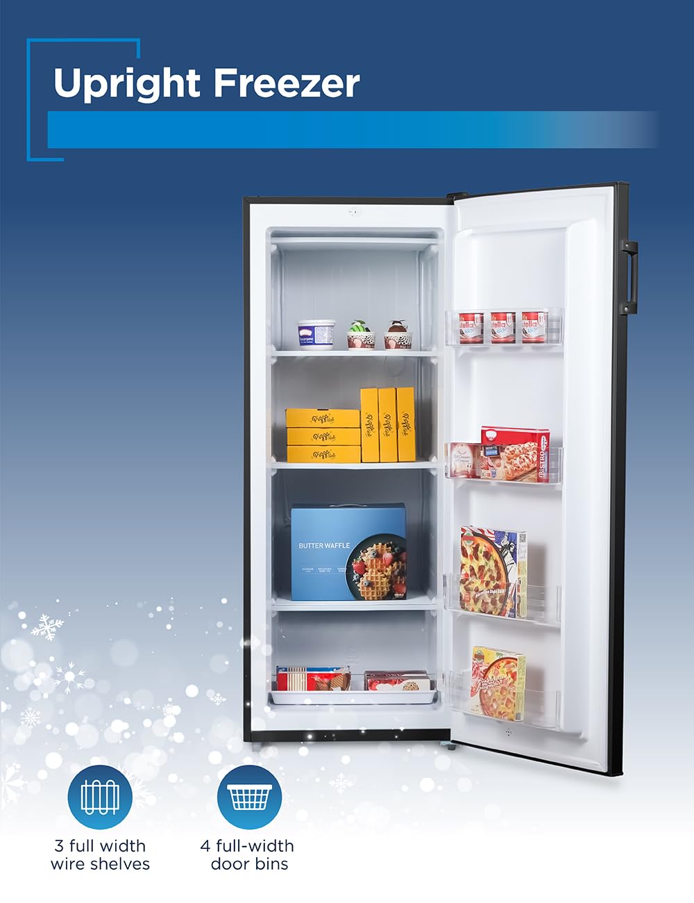 Efficient Storage Solutions: Featuring 3 full-width freezer shelves and 4 door bins, this standing freezer upright provides organized storage and easy access to your frozen items