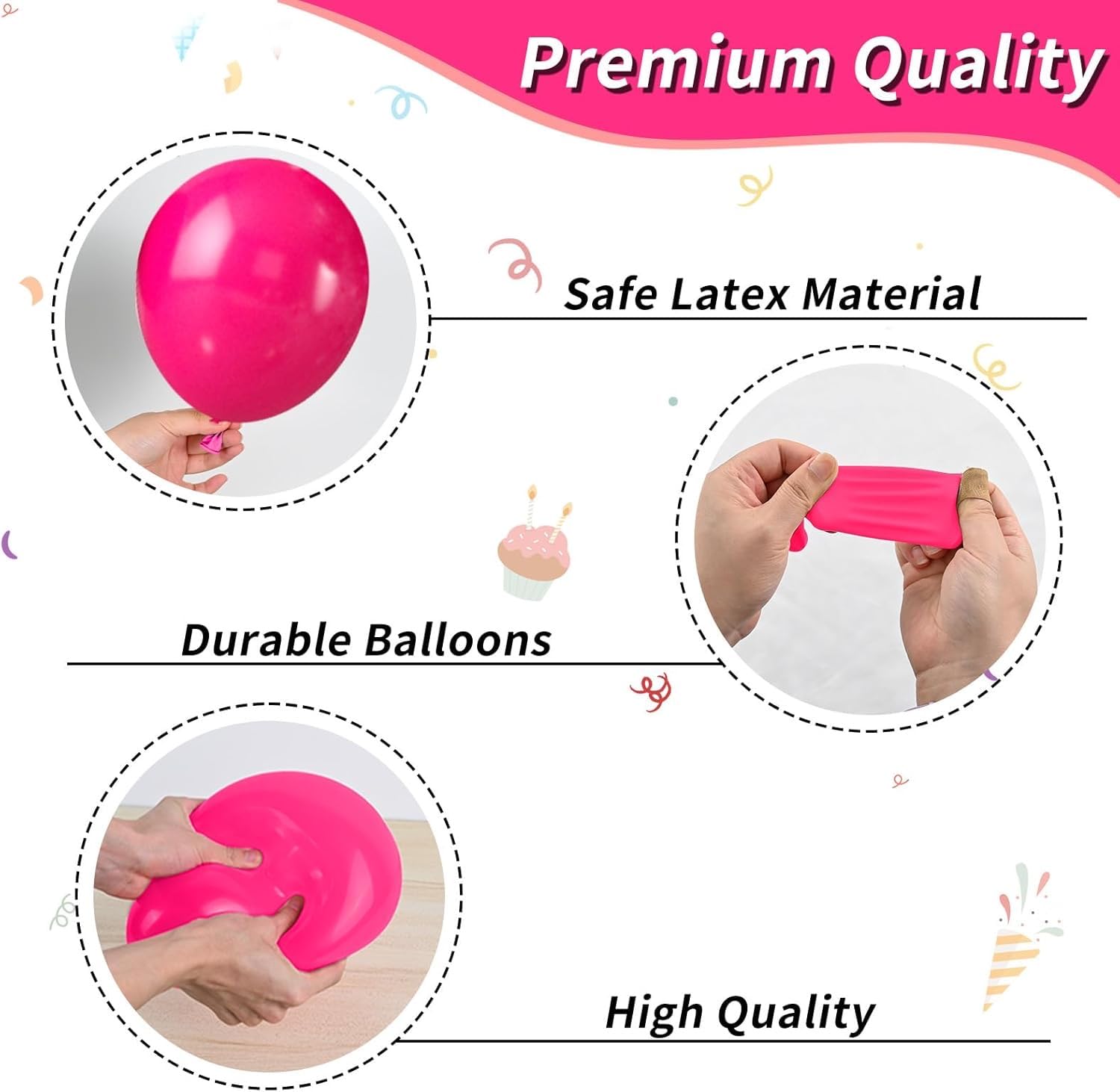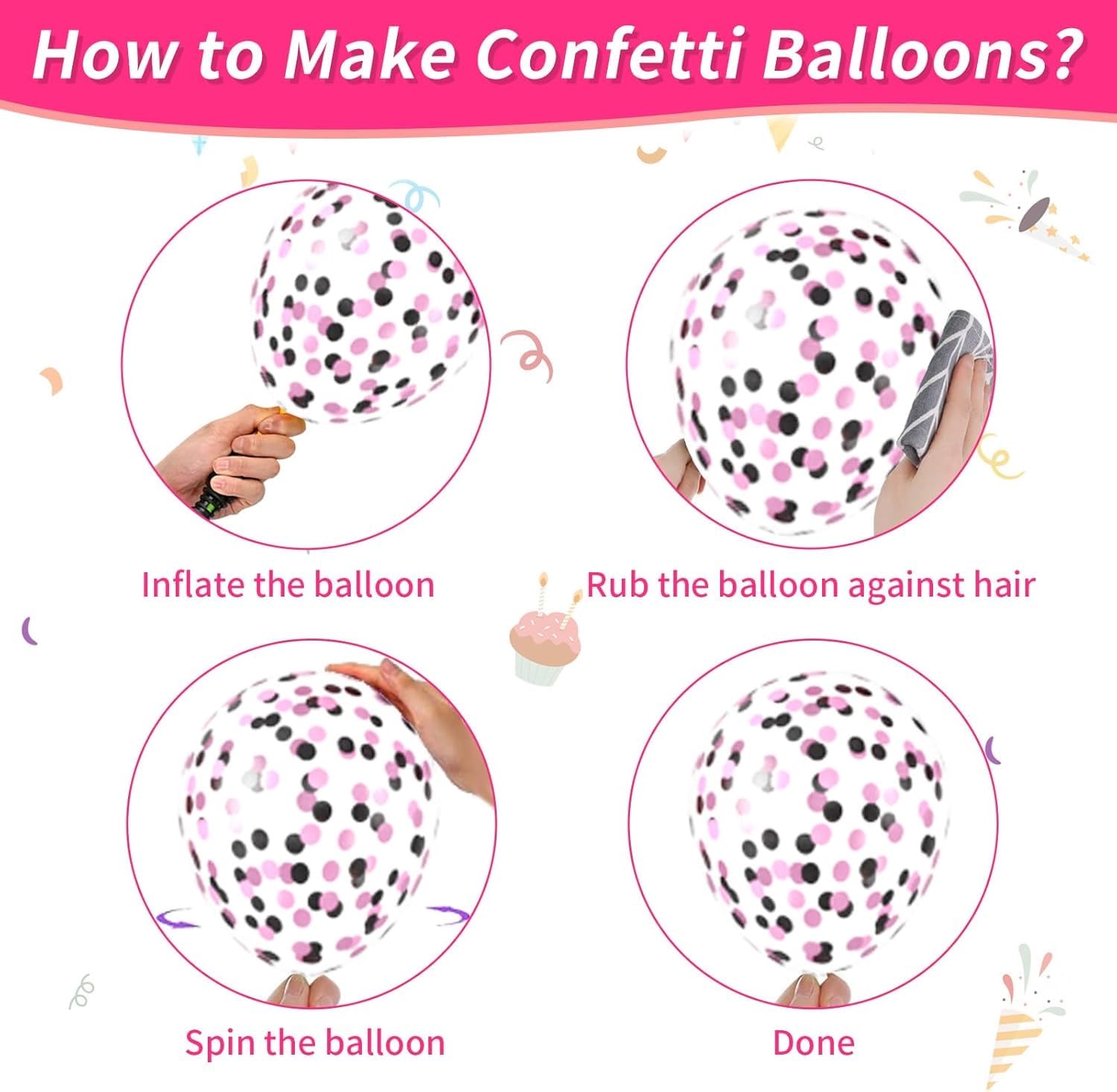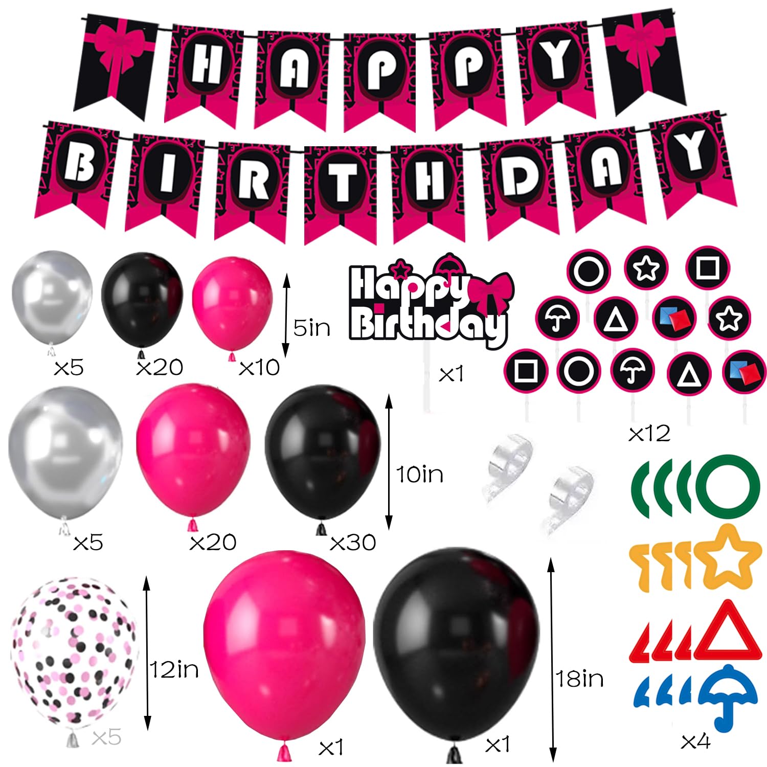 Totally 97pcs balloons, including 2pcs 18" latex balloons (balck pink), 55pcs 10" latex balloons (balck pink sliver), 35pcs 5" latex balloons (balck pink sliver), 5pcs 12" confetti latex balloons, 1 set balloons tool, 1 set of happy birthday banner, 1pcs large cake topper, 12pcs cupcake toppers, 4pcs stickers with 4 different designs