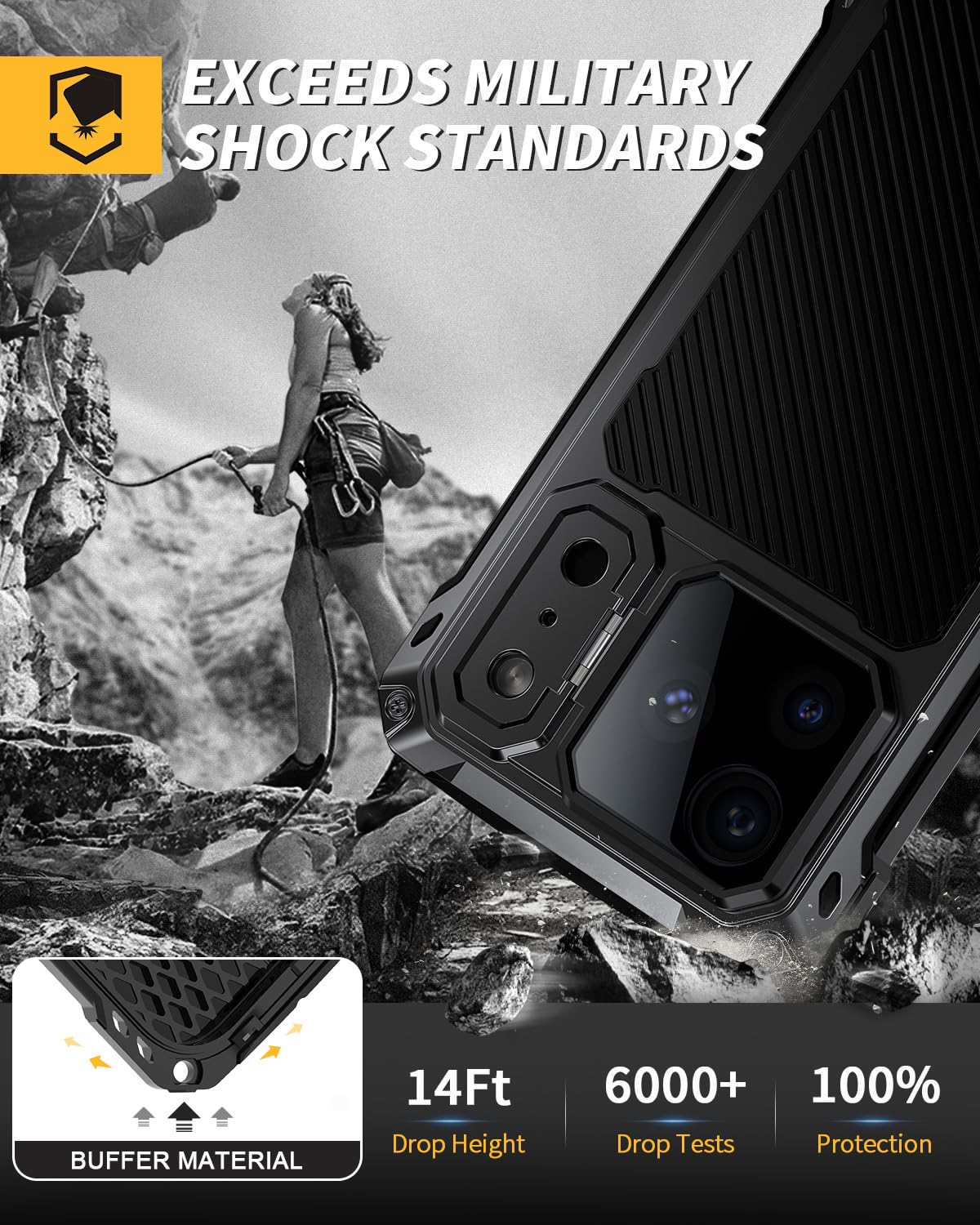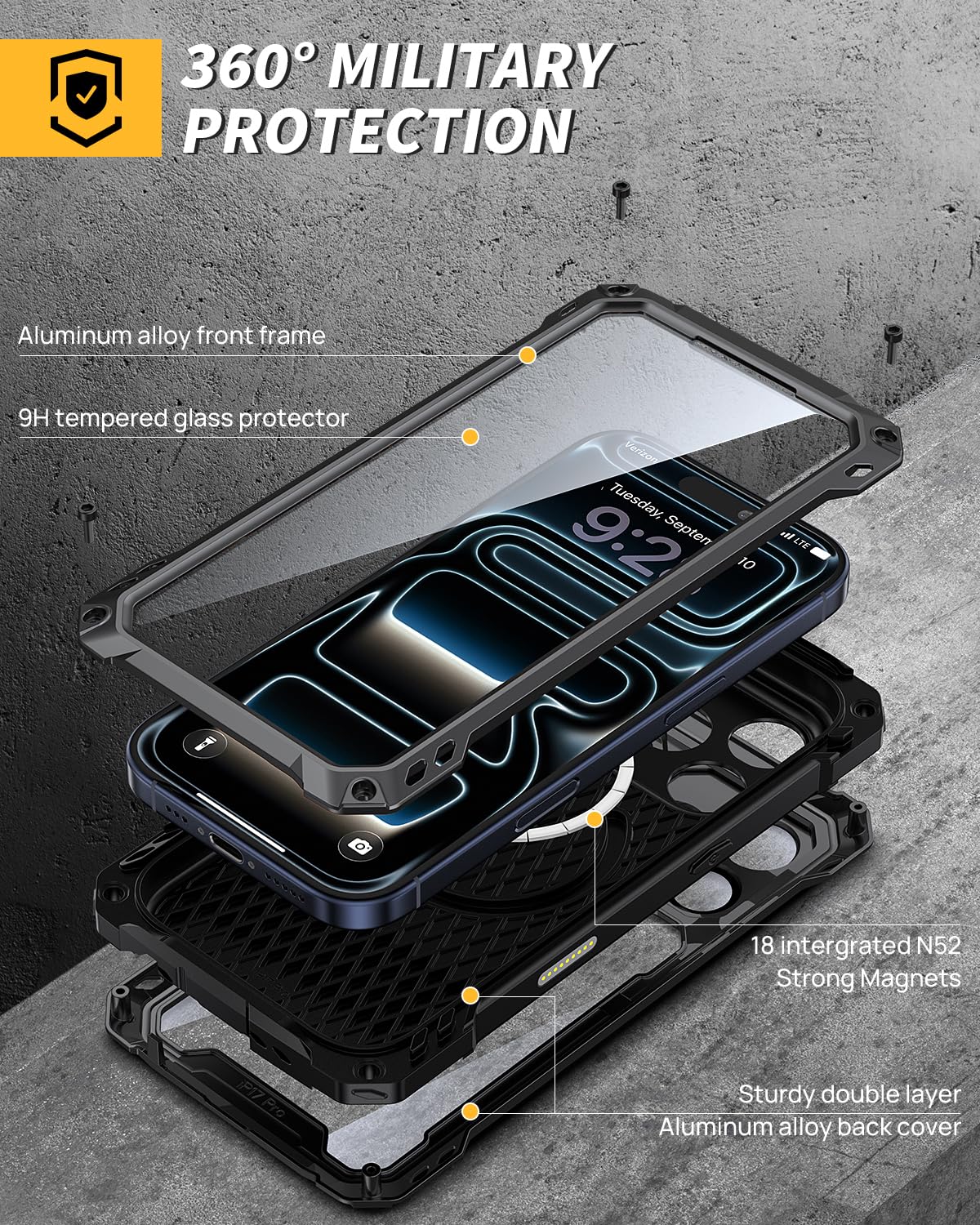 Military-Grade Shockproof & Full-Body Protection Built to the highest standards. This 17 pro strong case meets military-grade (MIL-STD-810G) standards for shockproof and dustproof performance. The reinforced structure and 360° tempered glass screen protector work together to defend your iPhone against drops, impacts, and daily abrasions