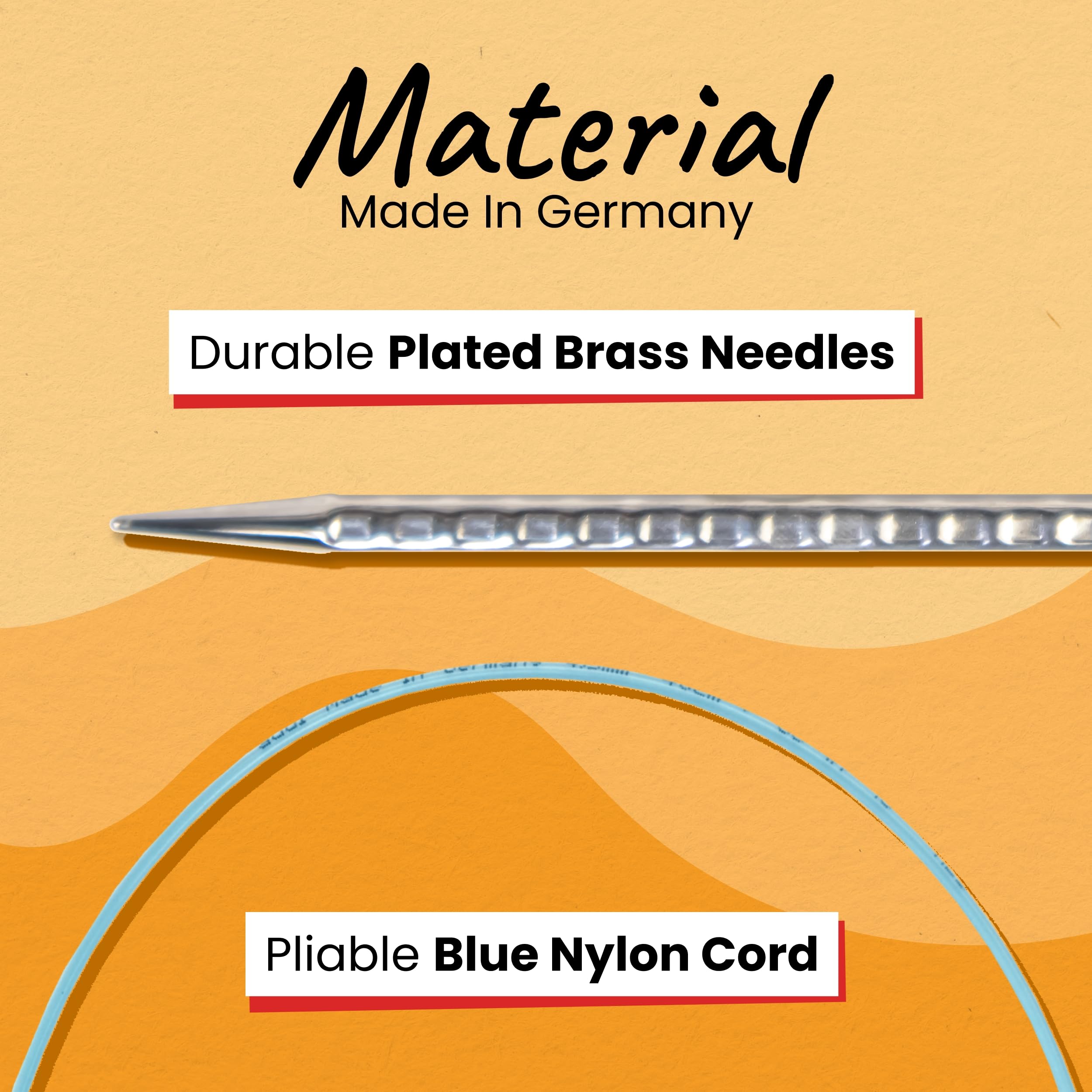 CIRCULAR KNITTING NEEDLES: Each pair features plated brass tips for smooth gliding and precision control, paired with a flexible blue nylon cord to reduce wrist strain and keep your knitting flow effortless