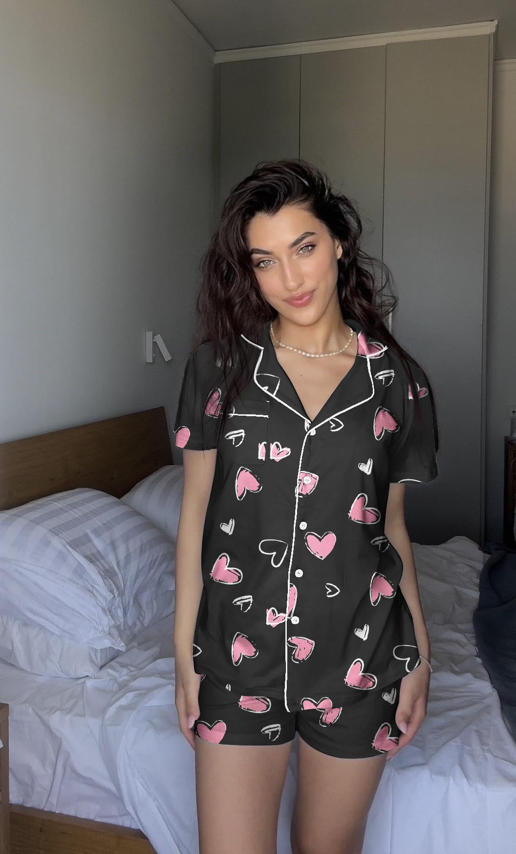 HUMANIZATION DESIGN: Features a hip-length button-down top with notch collar and chest pocket. Shorts include a chiffon drawstring elastic waist for maximum comfort.