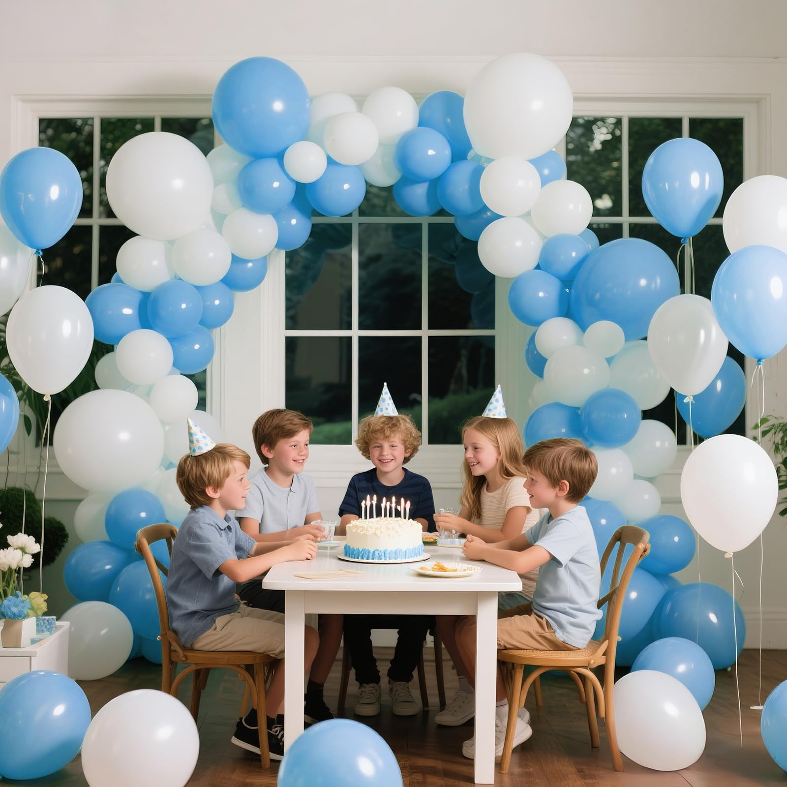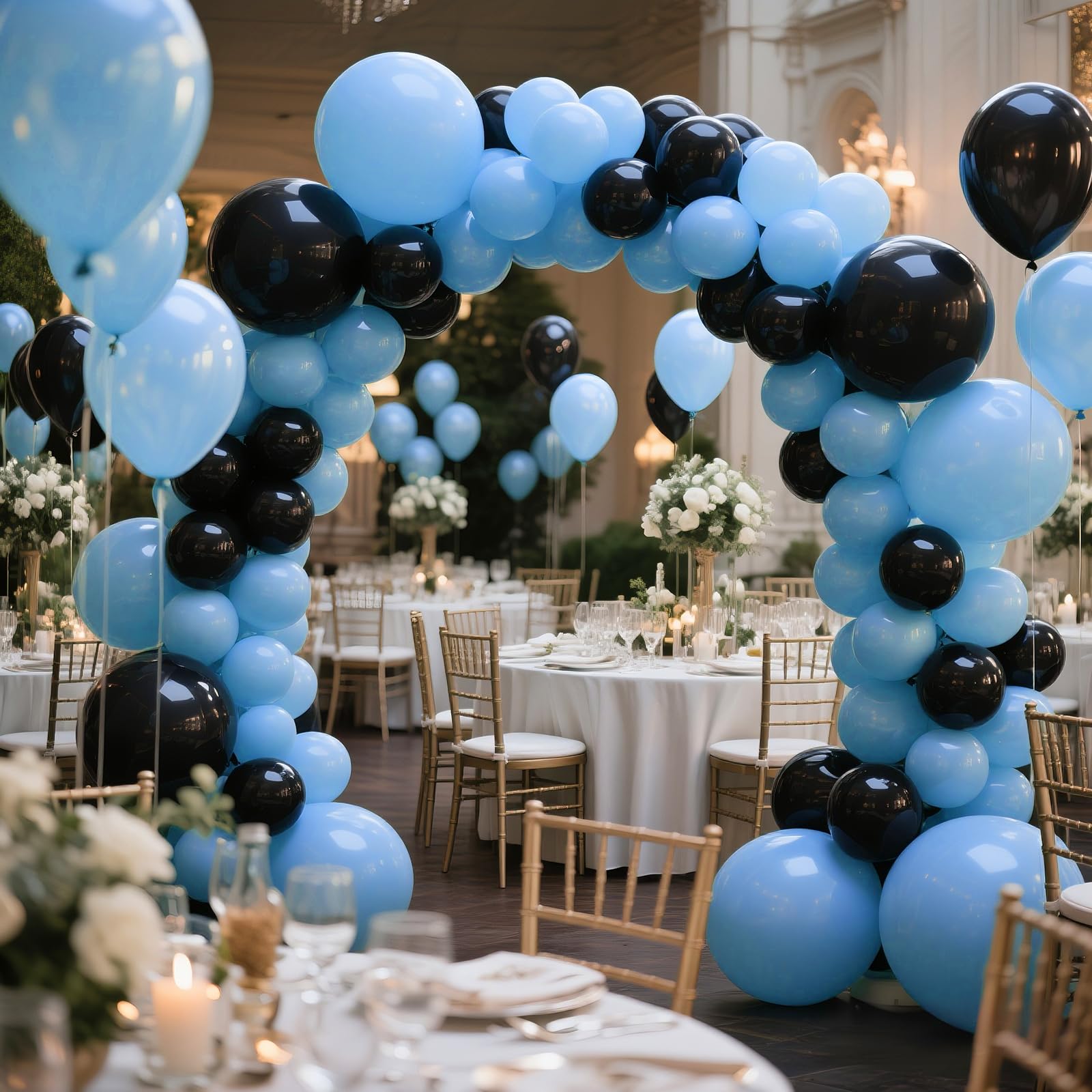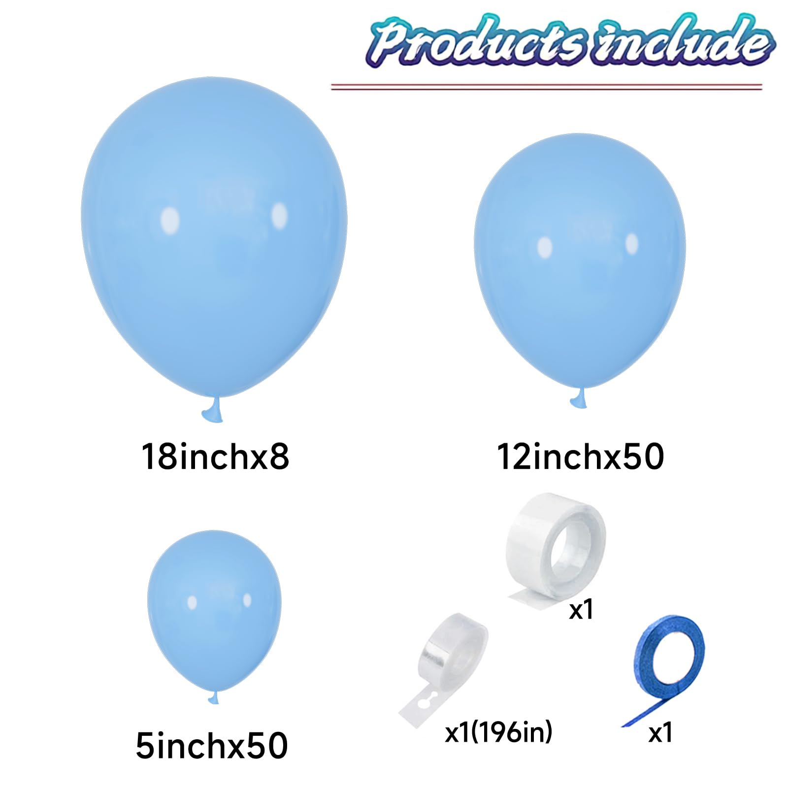 Baby Blue balloon garland kit: 111Pcs baby Blue balloons pack, including 8 pcs 18 inch balloons, 50 pcs 12 inch balloons, 50 pcs 5 inch balloons, a 5 meter balloon chain, 100 dots of glue dots, a roll of ribbon.