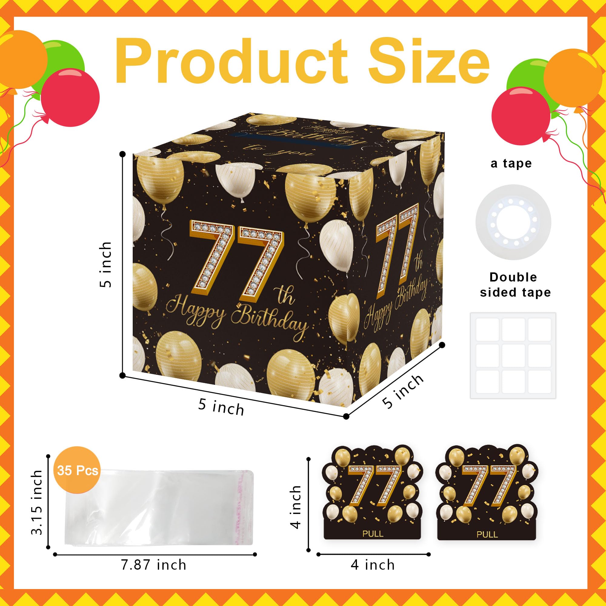 Surprise Gift Box: this gift box measures 5x5 inches, is made of durable cardboard. It also includes 2 theme-related shaped card(with adhere glue dots), 1 roll of transparent tape and 35 plastic pouches similar to the size of U.S. currency for easy placement of bills.