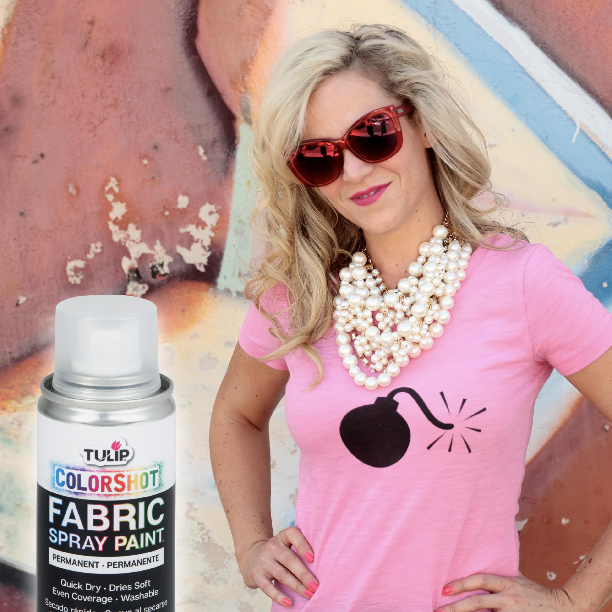 Give your fabrics an instant shot of beautiful, washable, permanent color with Tulip ColorShot Instant Fabric Color. It’s perfect for a dash of color or for allover even coverage, and works wonderfully with stencils and monograms! ColorShot is so easy to use just shake, aim and spray for gorgeous color in classic, neon and shimmer shades that dry super quick and soft to the touch, without drips or splatters. And it is so easy to blend colors, too! So when your apparel and home décor fabrics need a color renew, refresh or redo, add maximum color appeal with Tulip ColorShot Instant Fabric Color! Give your fabrics an instant shot of beautiful color with this easy to use fabric spray paint!