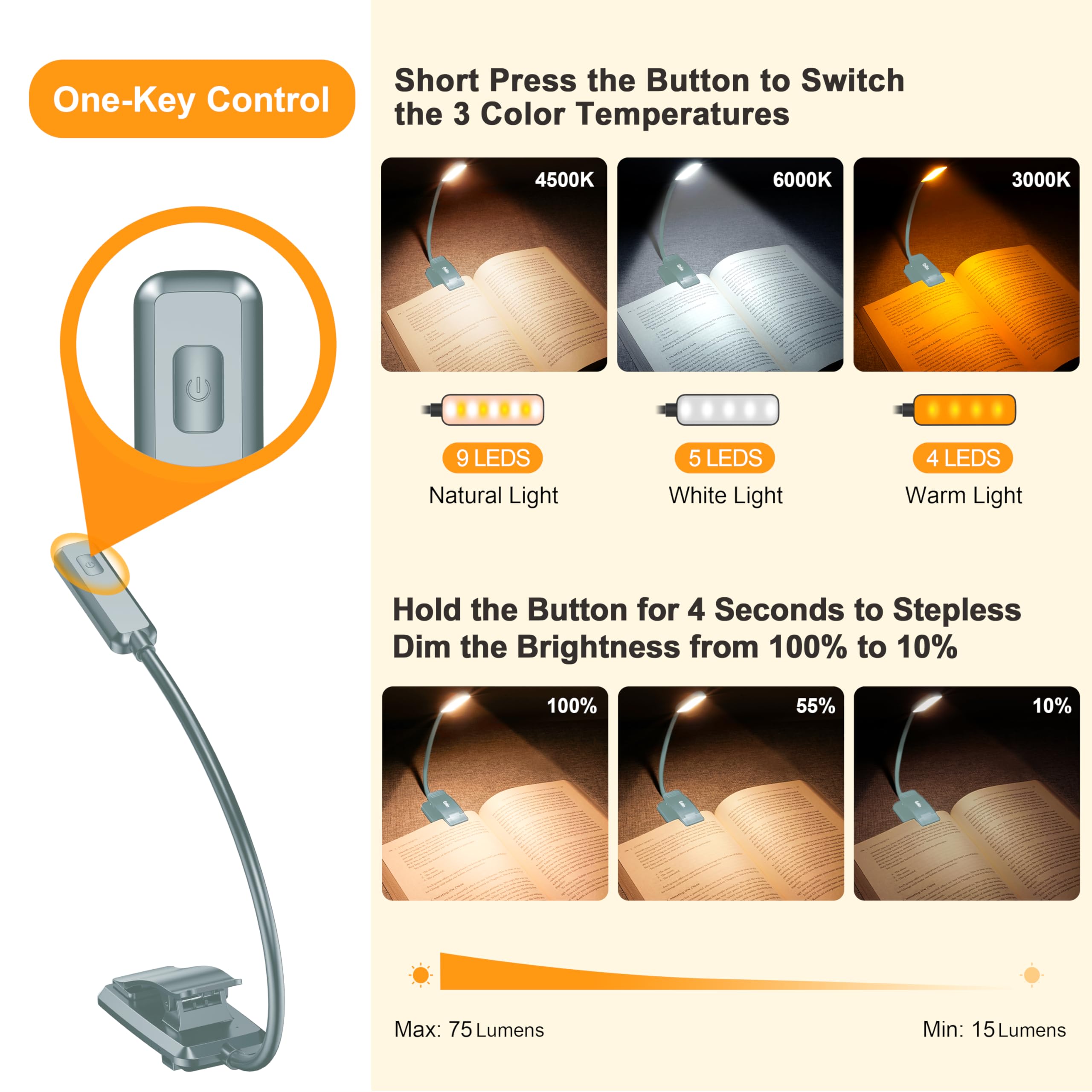 Stepless Dimming and 3 Color Modes: Adjust the brightness from 100% to 10% by long press button to suit different reading environment. Simple switch 3 color temperature lighting modes by clicking the button: mixed color, cool white, warm