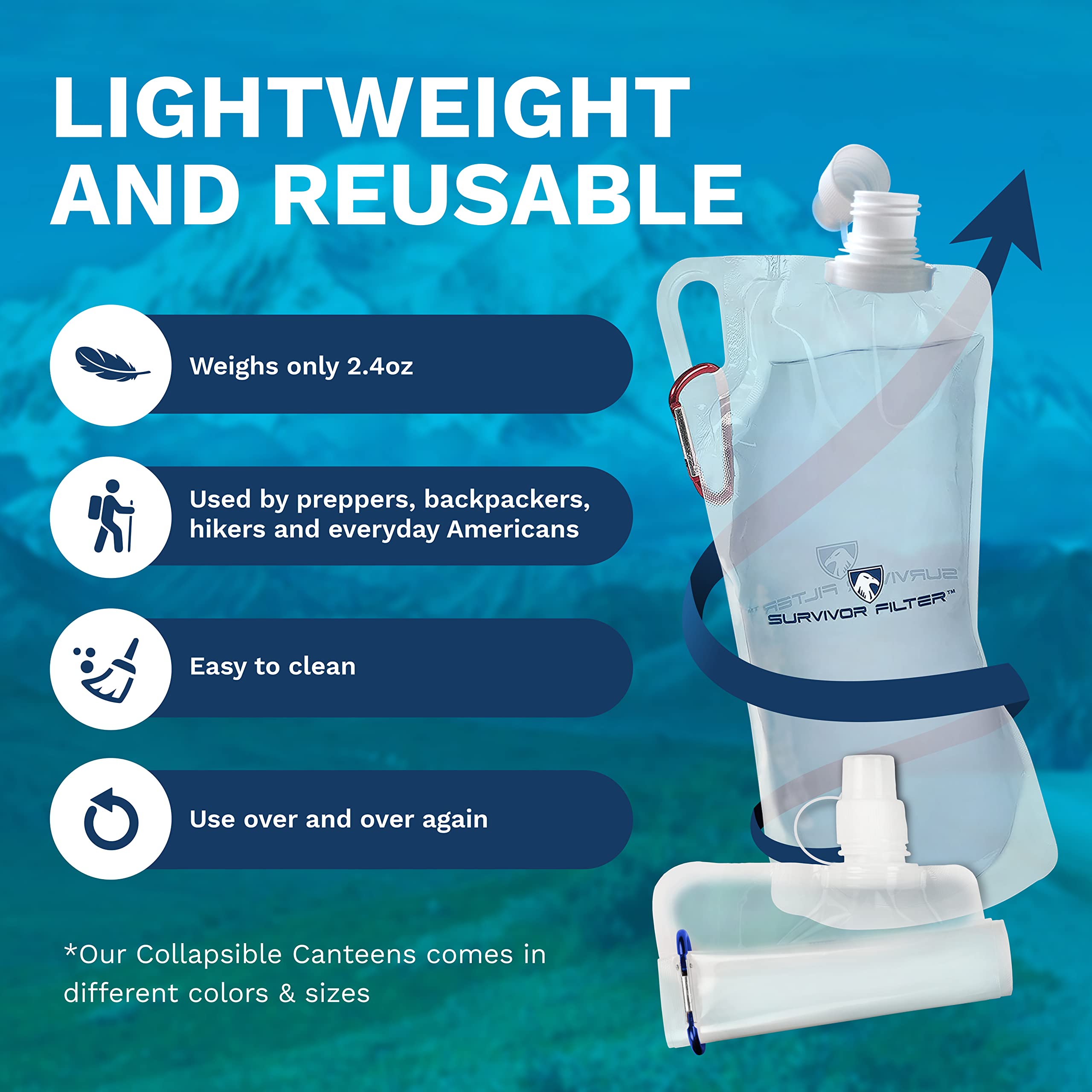 Collapsible Water Bottle - Ideal collapsible water bottles for traveling. Each leak proof canteen can attach to any portable water filter with a 28 mm thread and holds 33oz (1L) of water.