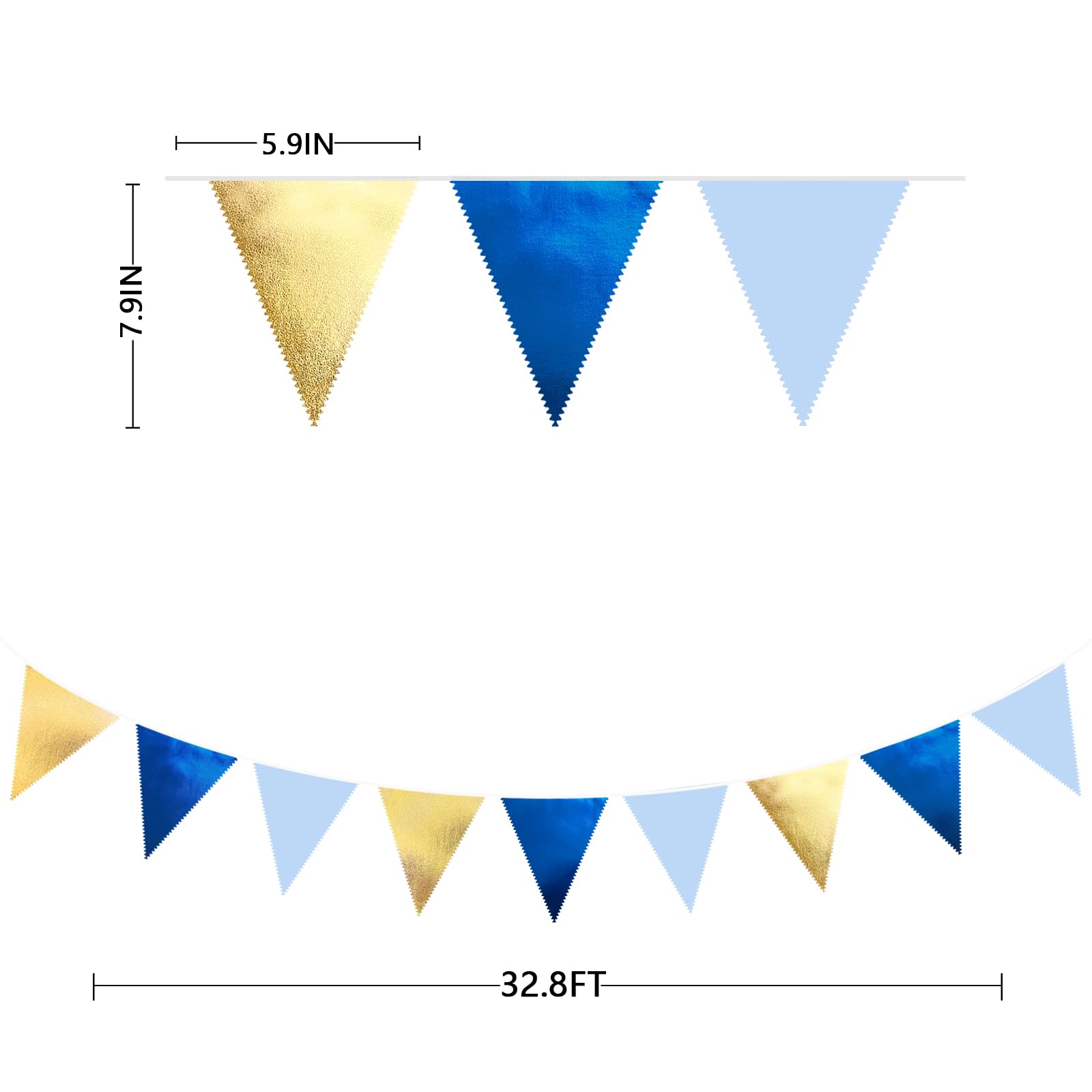 Package Contains - 1 packs of fabric gold and navy blue party pennant banner, Total 9.75meter/32feet with 36pcs flags.Size of each flag is 7.9 x 5.9 inch.