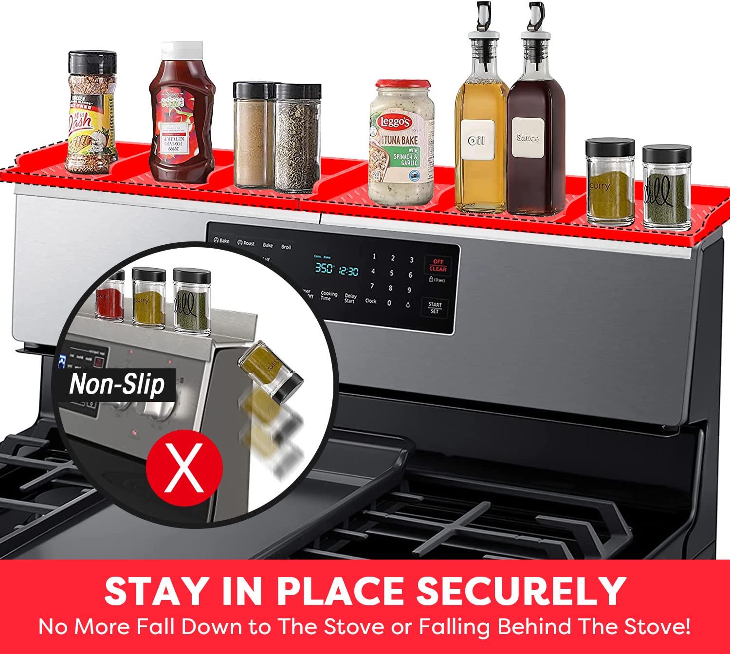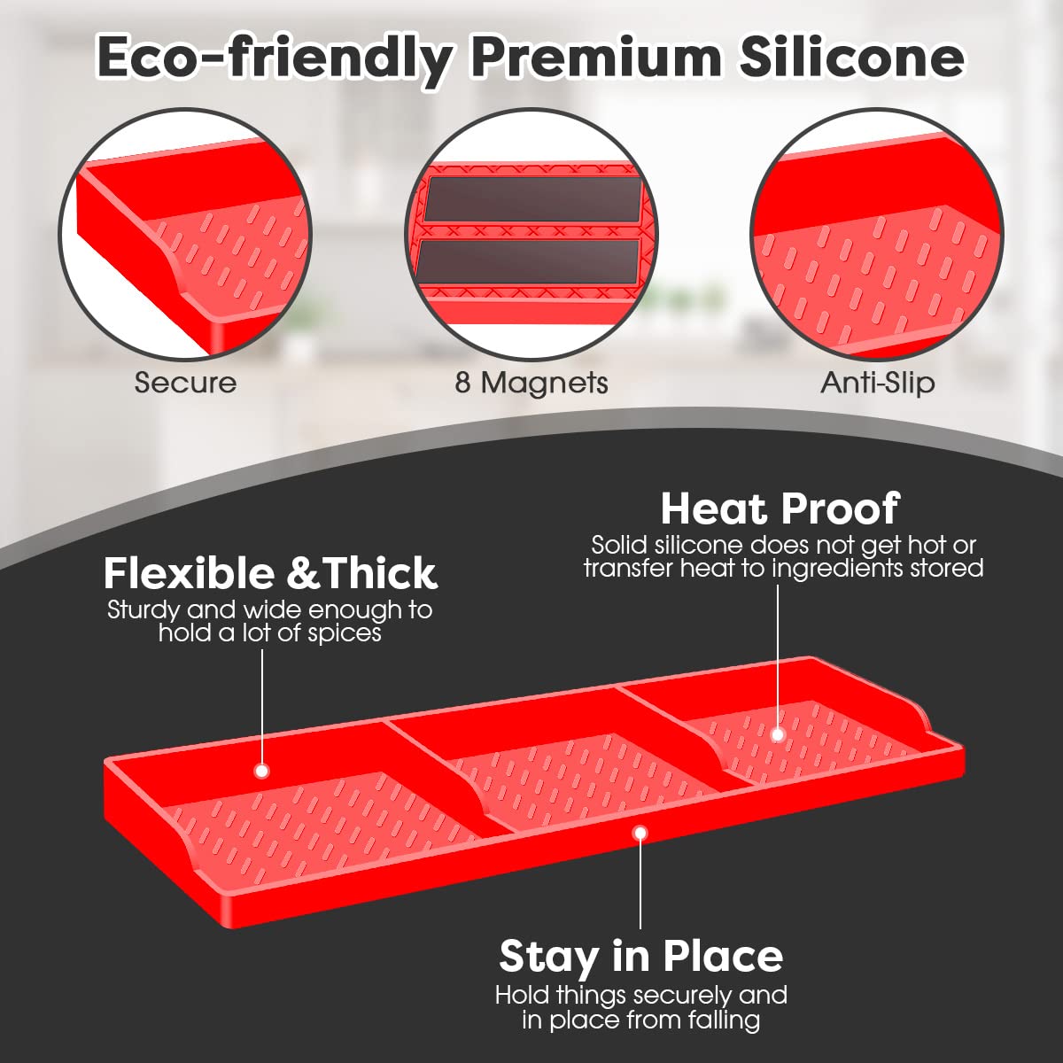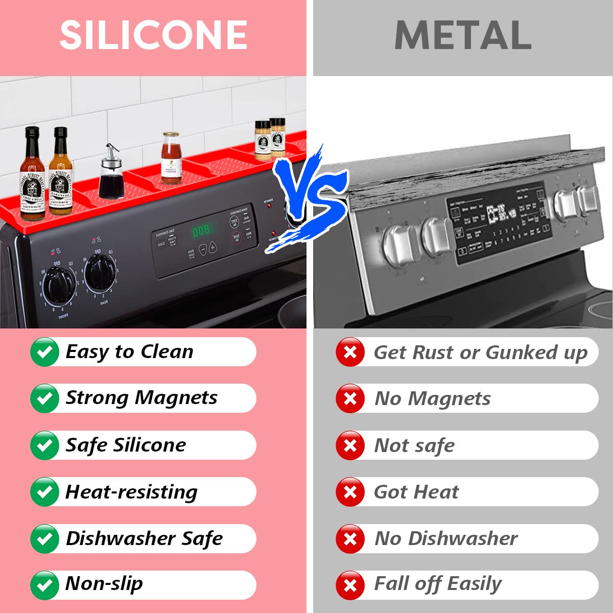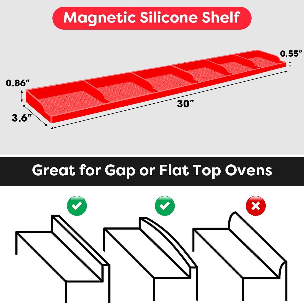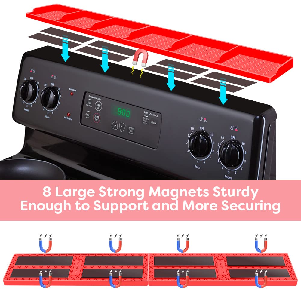 【Stay in Place】Silicone magnetic shelf for stove hold things on the back of stove securely and in place. your stuff won't fall down to the stove any more when you open and shut the stove door, bump. also helps block things from falling behind the stove.